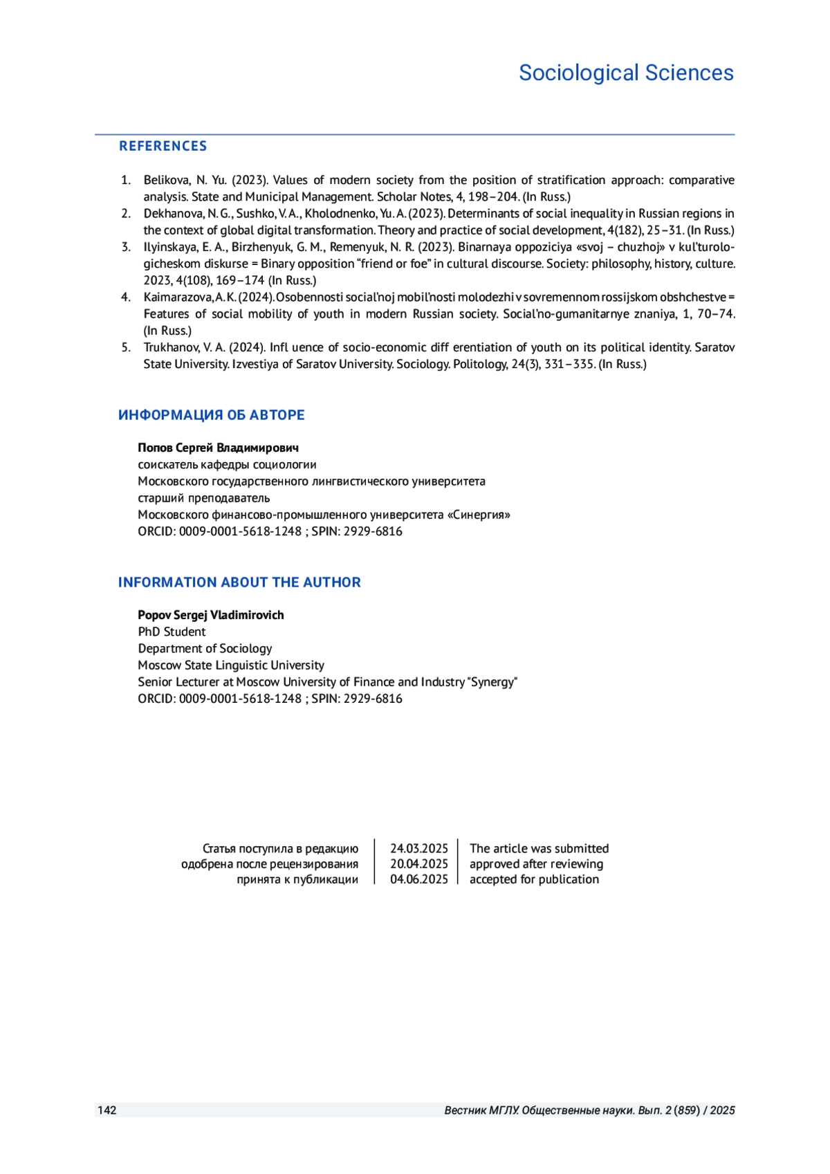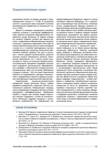 1. Беликова Н. Ю. Ценности современного общества с позиций стратификационного подхода: компаративный анализ // Государственное и муниципальное управление / Ученые записки. 2023. № 4. С. 198-204.
