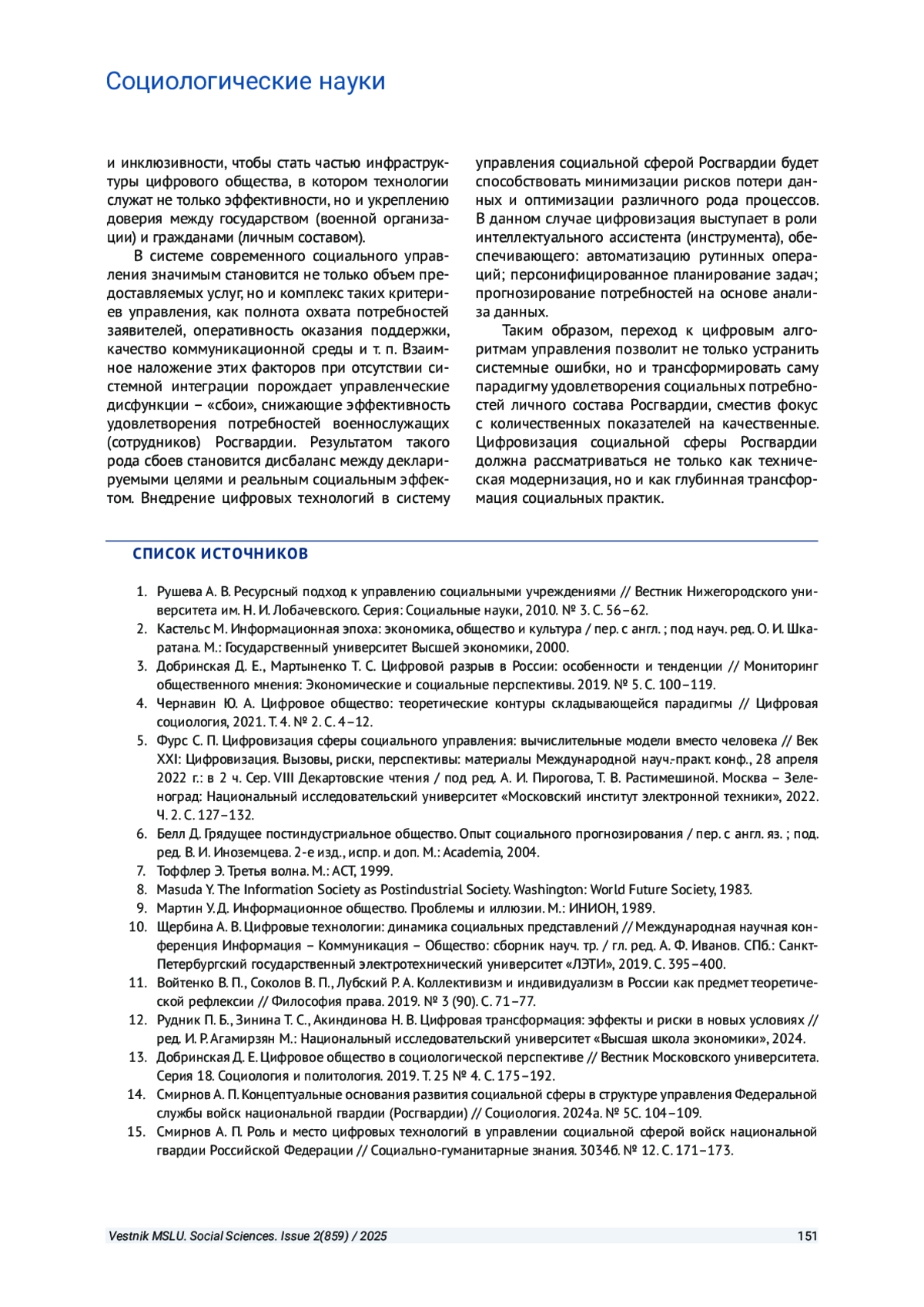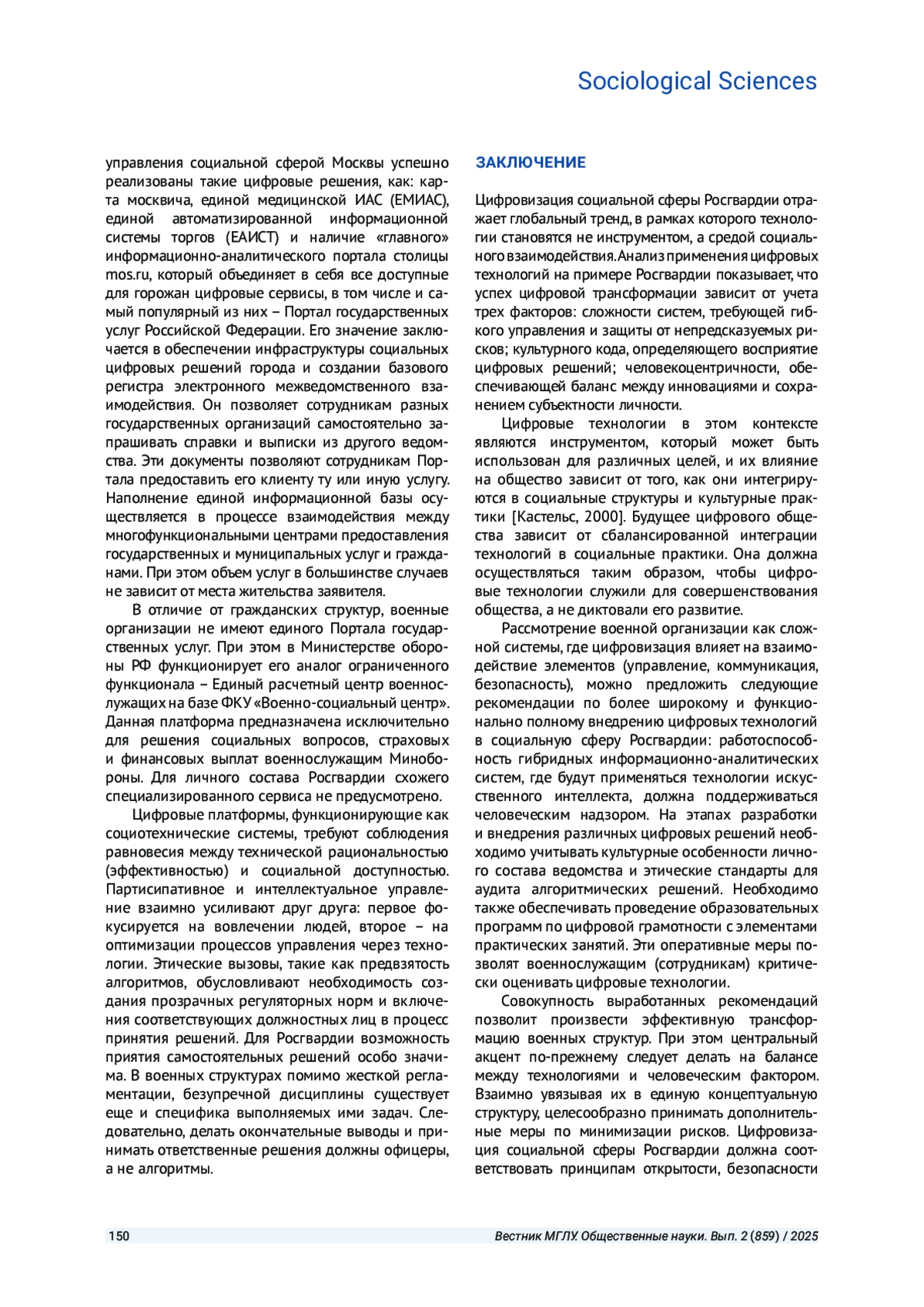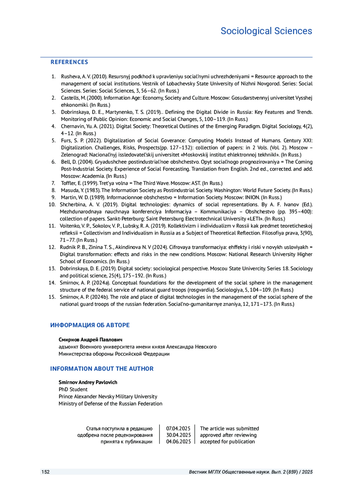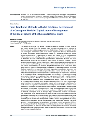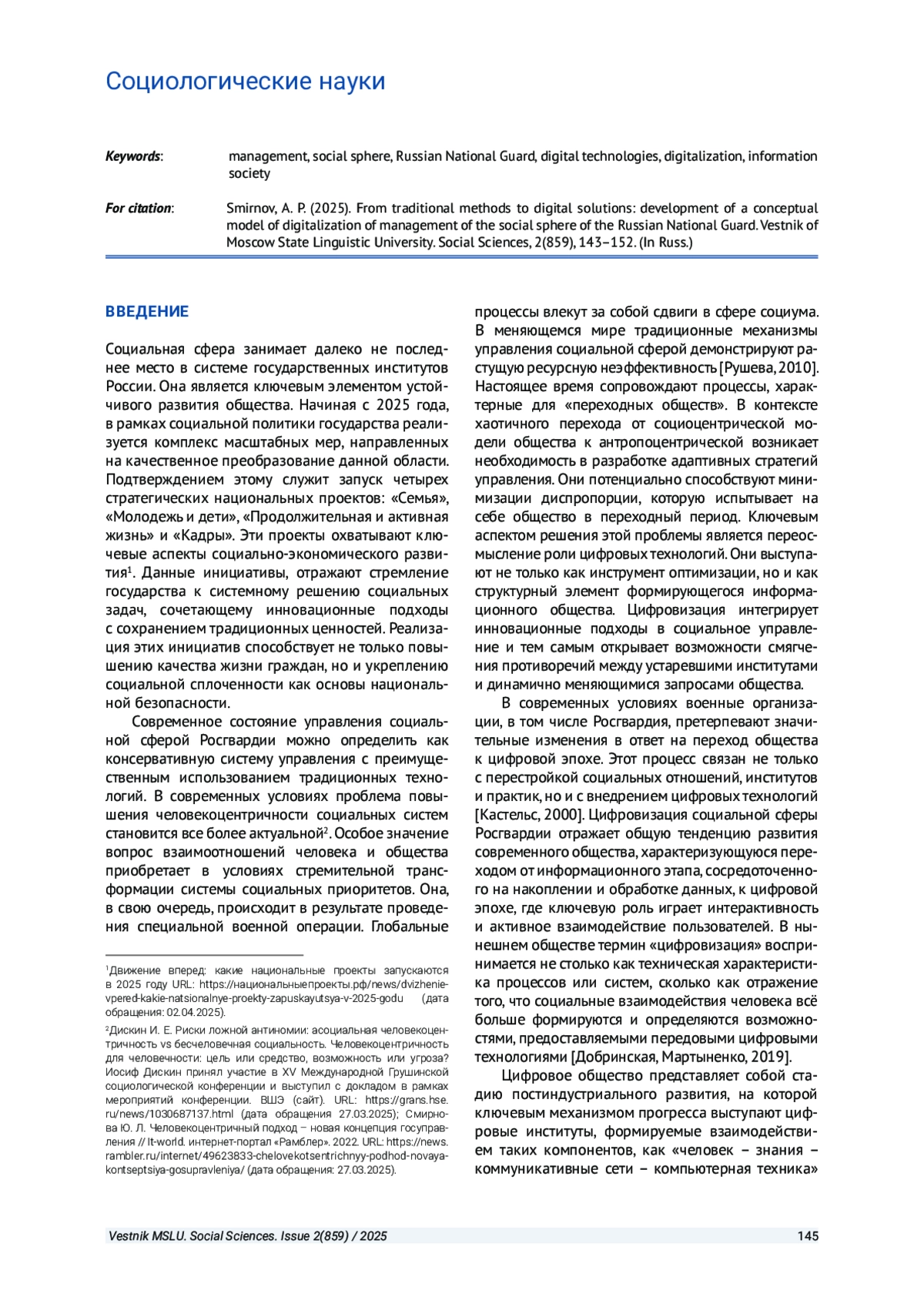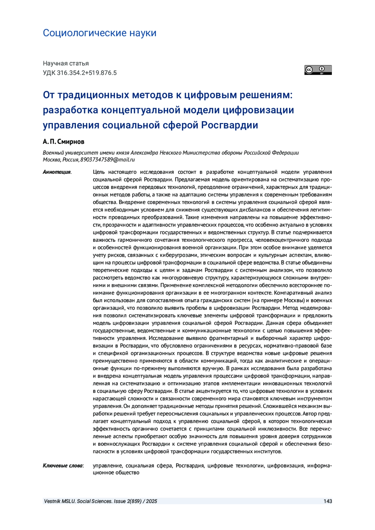 СМИРНОВ А. П. ОТ ТРАДИЦИОННЫХ МЕТОДОВ К ЦИФРОВЫМ РЕШЕНИЯМ: РАЗРАБОТКА КОНЦЕПТУАЛЬНОЙ МОДЕЛИ ЦИФРОВИЗАЦИИ УПРАВЛЕНИЯ СОЦИАЛЬНОЙ СФЕРОЙ РОСГВАРДИИ // ВЕСТНИК МОСКОВСКОГО ГОСУДАРСТВЕННОГО ЛИНГВИСТИЧЕСКОГО УНИВЕРСИТЕТА. ОБЩЕСТВЕННЫЕ НАУКИ. 2025. № 2 (859)