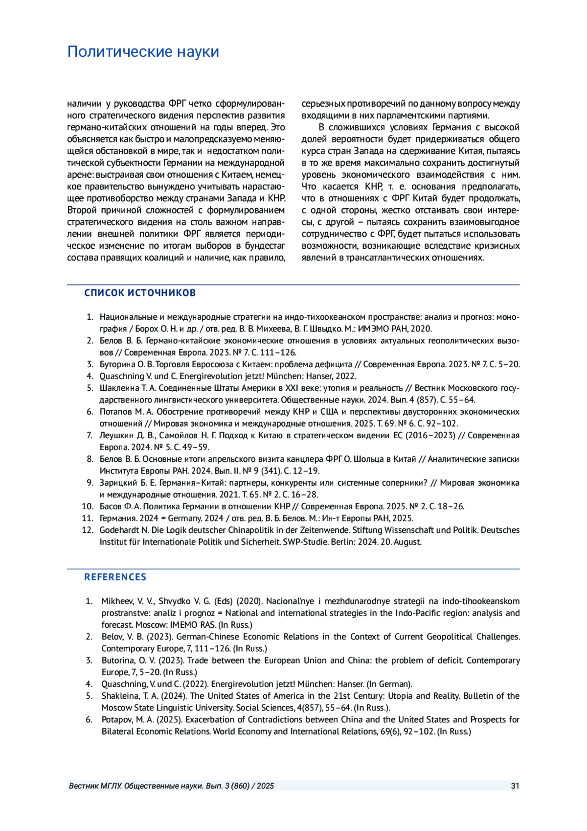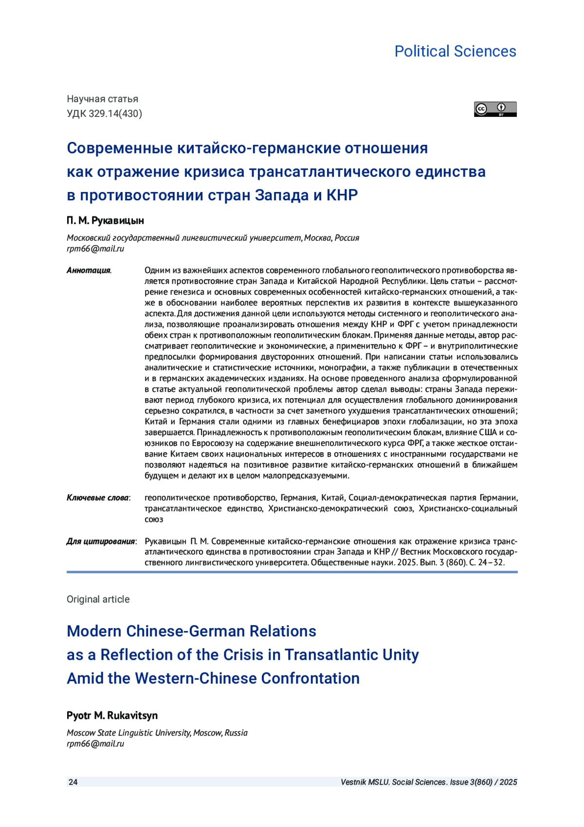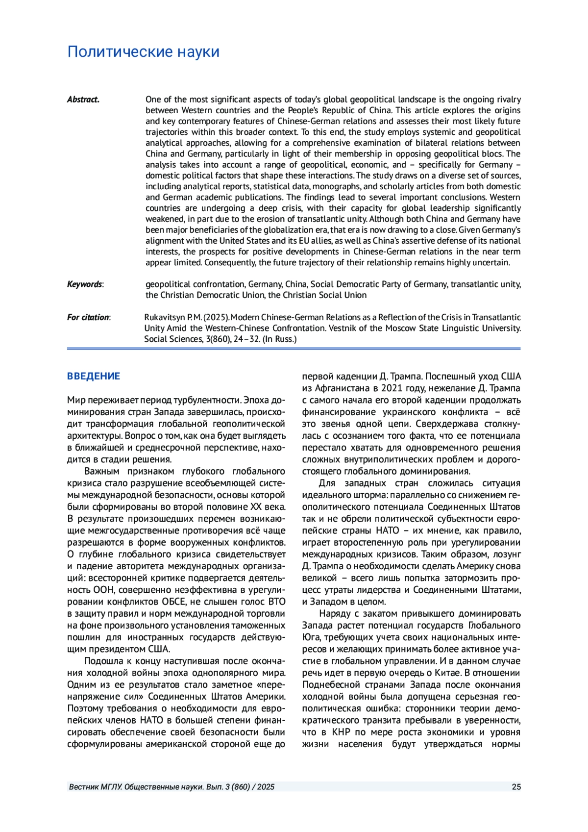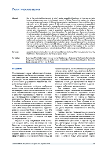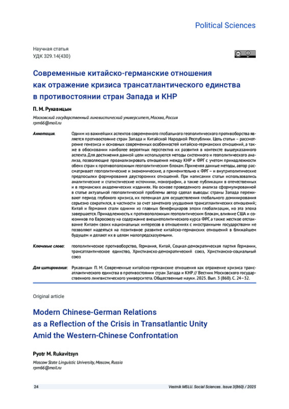 РУКАВИЦЫН П. М. СОВРЕМЕННЫЕ КИТАЙСКО-ГЕРМАНСКИЕ ОТНОШЕНИЯ КАК ОТРАЖЕНИЕ КРИЗИСА ТРАНСАТЛАНТИЧЕСКОГО ЕДИНСТВА В ПРОТИВОСТОЯНИИ СТРАН ЗАПАДА И КНР // ВЕСТНИК МОСКОВСКОГО ГОСУДАРСТВЕННОГО ЛИНГВИСТИЧЕСКОГО УНИВЕРСИТЕТА. ОБЩЕСТВЕННЫЕ НАУКИ. 2025. № 3 (860)