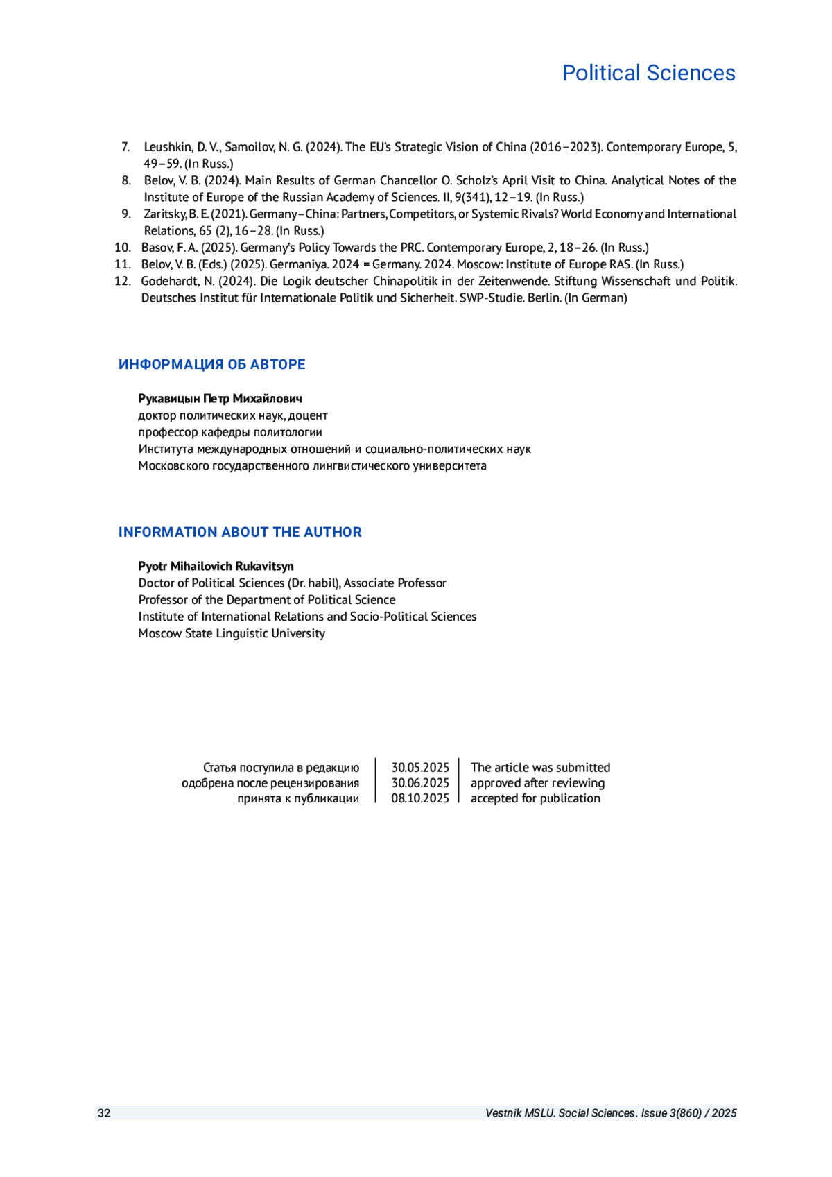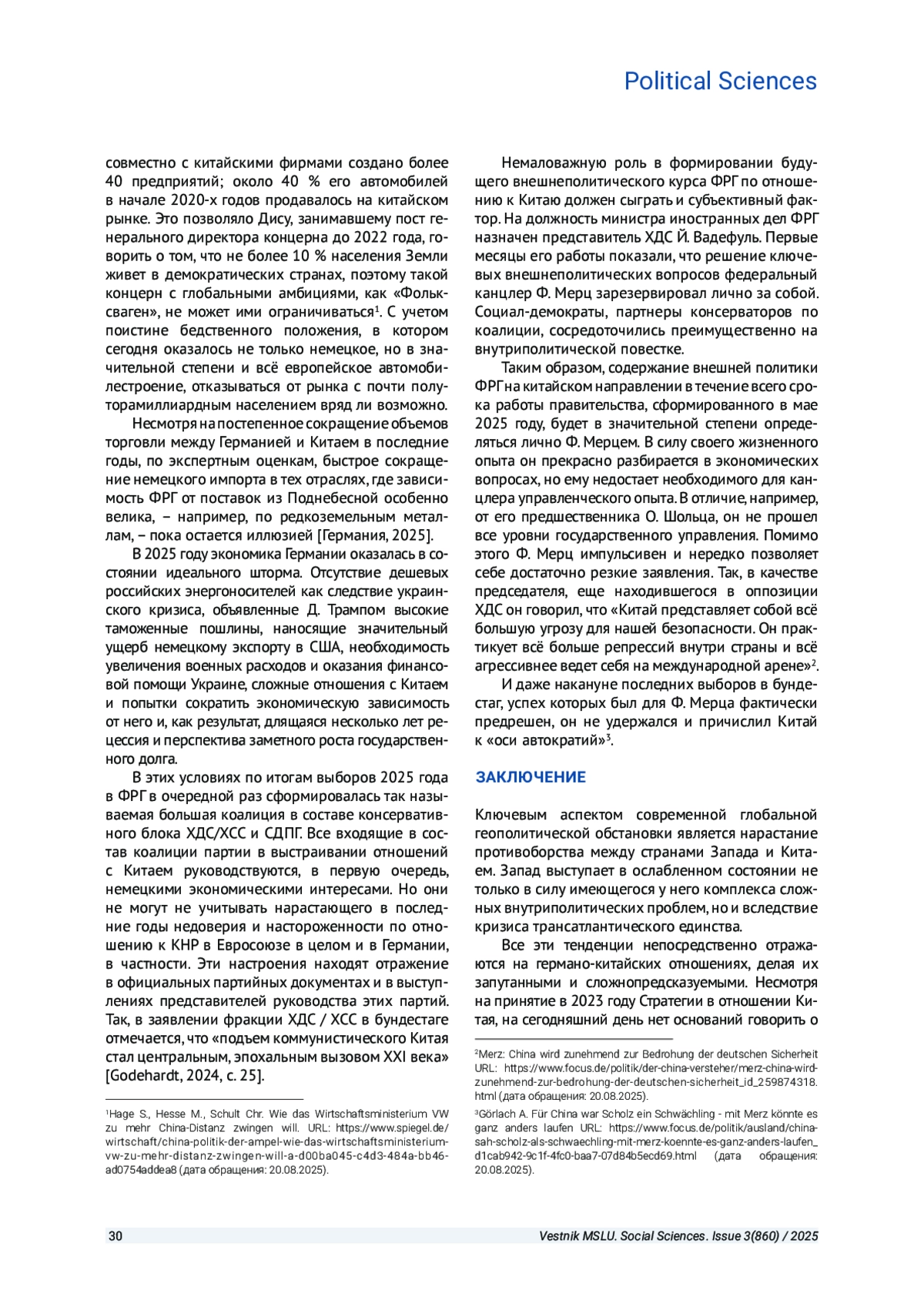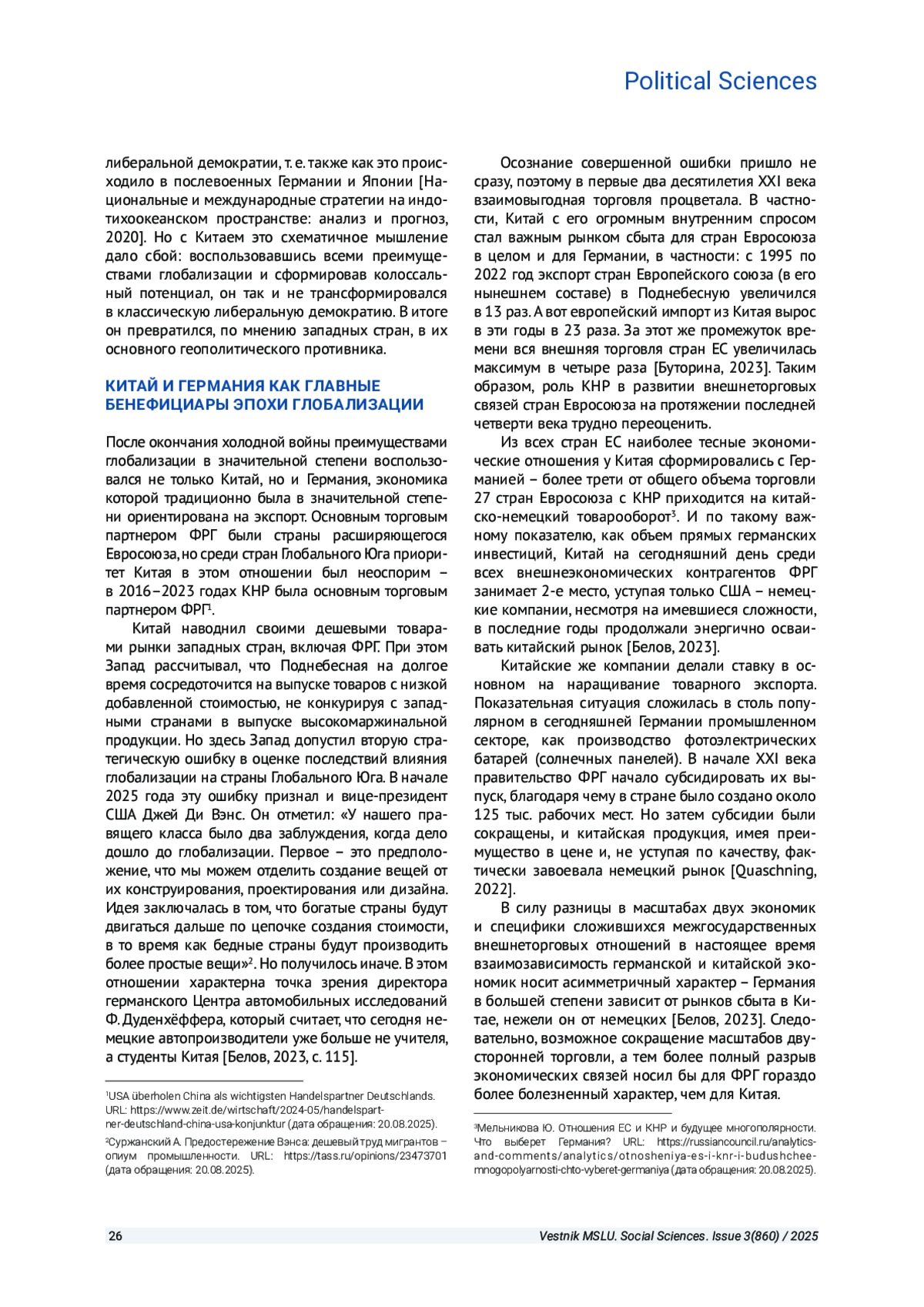 РУКАВИЦЫН П. М. СОВРЕМЕННЫЕ КИТАЙСКО-ГЕРМАНСКИЕ ОТНОШЕНИЯ КАК ОТРАЖЕНИЕ КРИЗИСА ТРАНСАТЛАНТИЧЕСКОГО ЕДИНСТВА В ПРОТИВОСТОЯНИИ СТРАН ЗАПАДА И КНР // ВЕСТНИК МОСКОВСКОГО ГОСУДАРСТВЕННОГО ЛИНГВИСТИЧЕСКОГО УНИВЕРСИТЕТА. ОБЩЕСТВЕННЫЕ НАУКИ. 2025. № 3 (860)