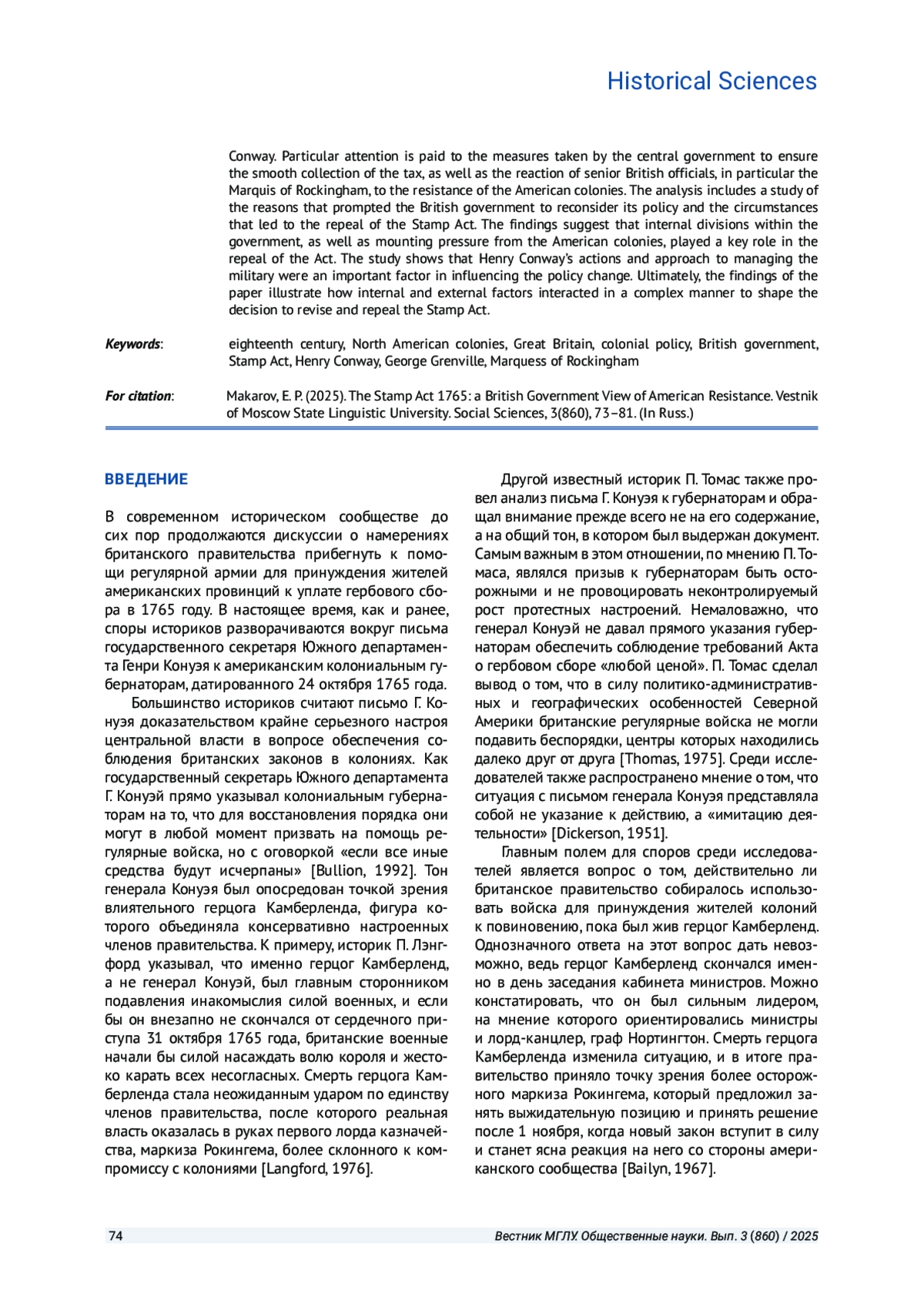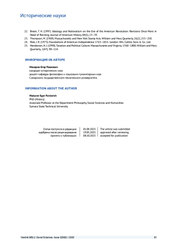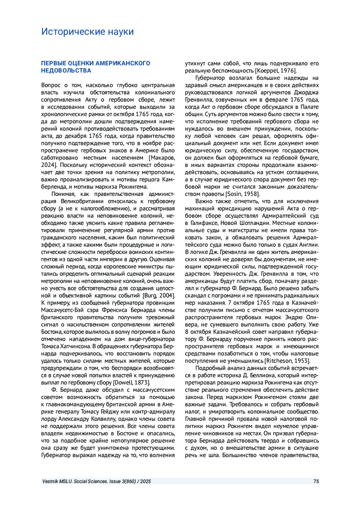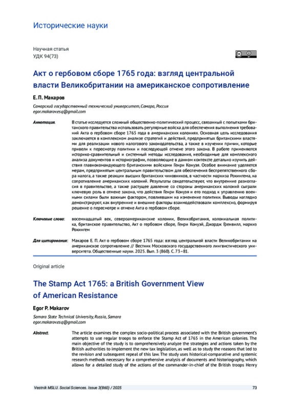 МАКАРОВ Е. П. АКТ О ГЕРБОВОМ СБОРЕ 1765 ГОДА: ВЗГЛЯД ЦЕНТРАЛЬНОЙ ВЛАСТИ ВЕЛИКОБРИТАНИИ НА АМЕРИКАНСКОЕ СОПРОТИВЛЕНИЕ // ВЕСТНИК МОСКОВСКОГО ГОСУДАРСТВЕННОГО ЛИНГВИСТИЧЕСКОГО УНИВЕРСИТЕТА. ОБЩЕСТВЕННЫЕ НАУКИ. 2025. № 3 (860)