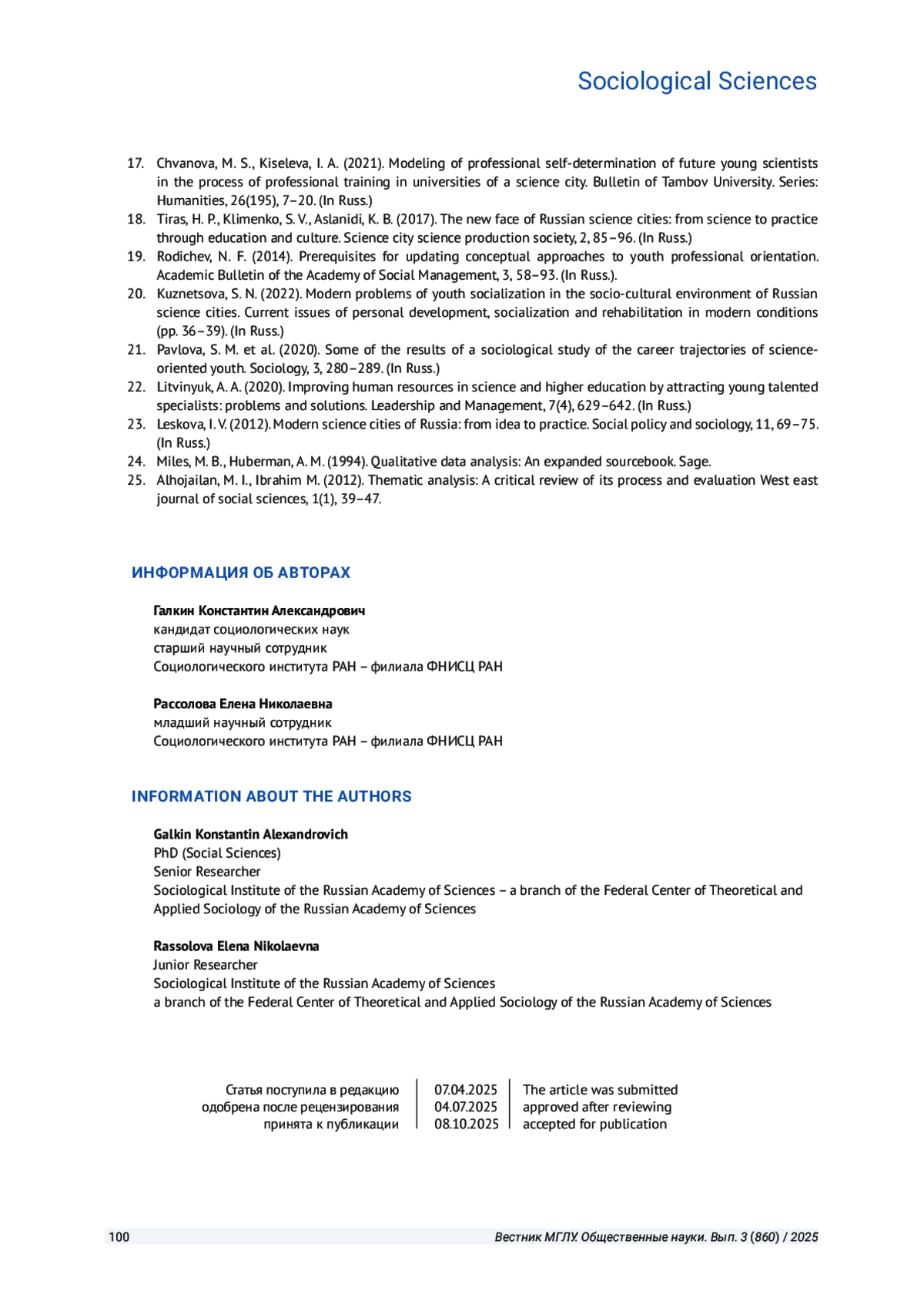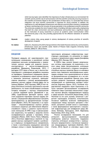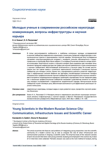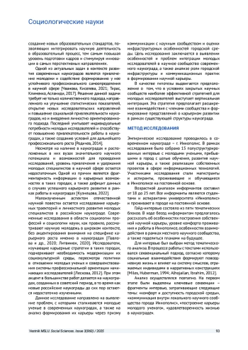 ГАЛКИН К. А., РАССОЛОВА Е. Н. МОЛОДЫЕ УЧЕНЫЕ В СОВРЕМЕННОМ РОССИЙСКОМ НАУКОГРАДЕ: КОММУНИКАЦИЯ, ВОПРОСЫ ИНФРАСТРУКТУРЫ И НАУЧНАЯ КАРЬЕРА // ВЕСТНИК МОСКОВСКОГО ГОСУДАРСТВЕННОГО ЛИНГВИСТИЧЕСКОГО УНИВЕРСИТЕТА. ОБЩЕСТВЕННЫЕ НАУКИ. 2025. № 3 (860)