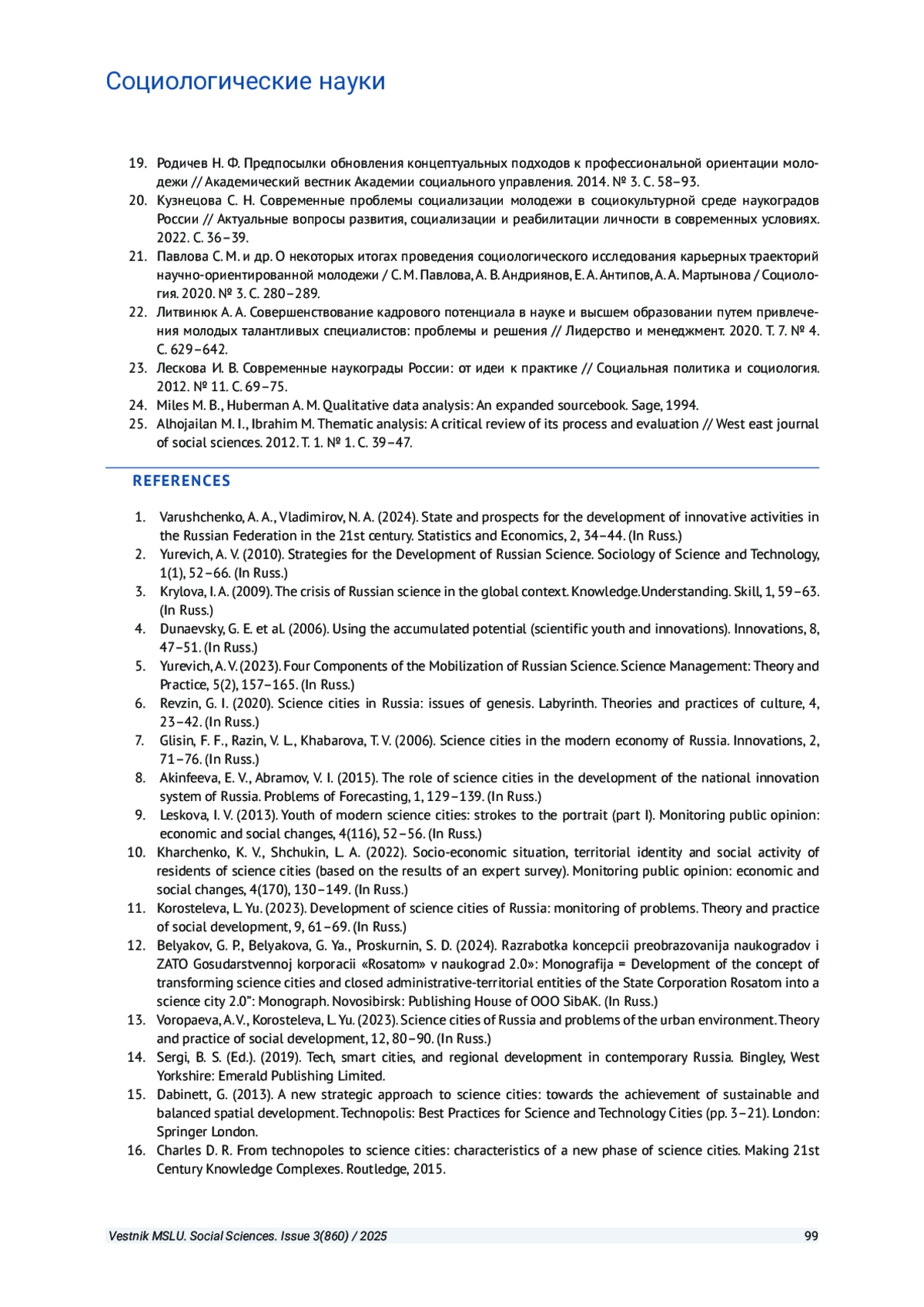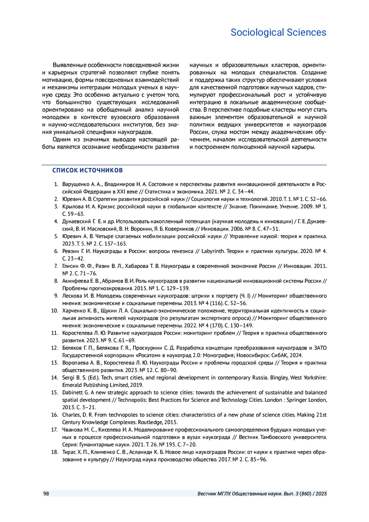 Статья: МОЛОДЫЕ УЧЕНЫЕ В СОВРЕМЕННОМ РОССИЙСКОМ НАУКОГРАДЕ: КОММУНИКАЦИЯ, ВОПРОСЫ ИНФРАСТРУКТУРЫ И НАУЧНАЯ КАРЬЕРА (2025)