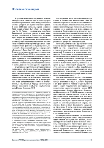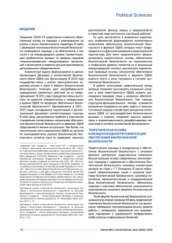Пандемия COVID-19 существенно изменила общественный взгляд на подходы к реагированию на угрозы и риски биологического характера. В связи с эволюцией понимания биологической безопасности развиваются подходы к ее обеспечению, в том числе и на международном уровне. Соответствующая проблематика выходит за пределы мандатов специализированных международных организаций и включается в повестки дня для рассмотрения региональными объединениями.