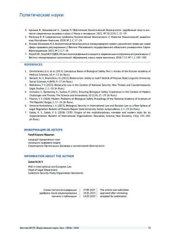 5. Филонов В. В. Современные проблемы биологической безопасности // Известия Национальной академии наук Республики Киргизия. 2020. № 2. С. 17-24.