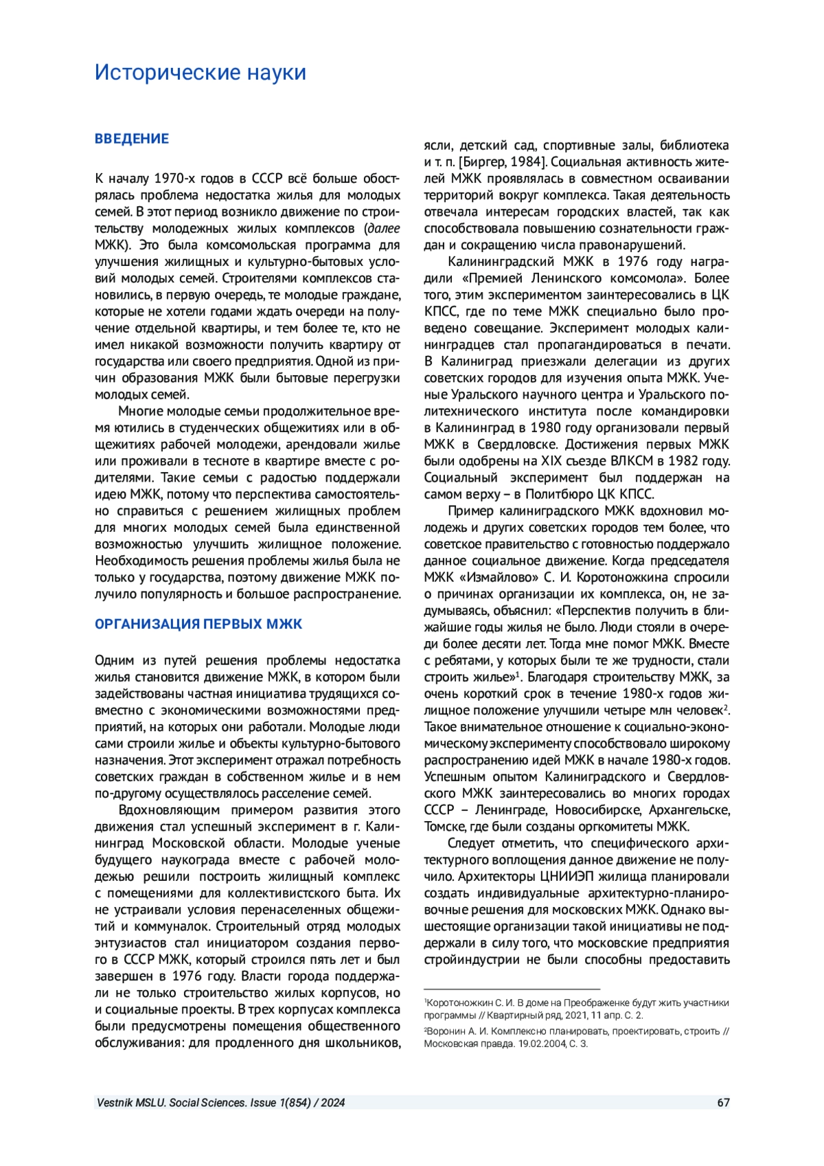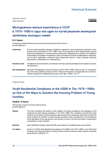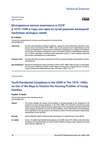 В статье рассматривается решение проблемы недостатка жилья появлением движения молодежных жилых комплексов в 1970-1980-е годы. В этом движении были задействованы частная инициатива трудящихся и экономические возможности предприятий, на которых они работали. Анализируется специфика молодежных жилых комплексов, которая способствовала концентрации на одной территории населения одной возрастной группы, а также основные принципы организации, противоречия в их деятельности.