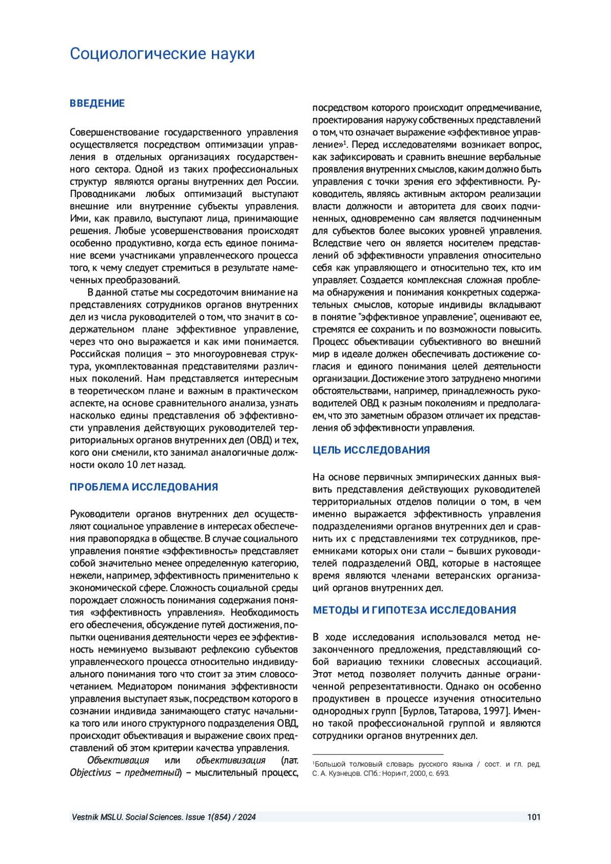 В статье на основе эмпирических данных показан сравнительный анализ представлений руководителей органов внутренних дел о критериях эффективности управления. Обнаружена и описана содержательная разница в концептуализации понимания категории «эффективное управление» руководителей двух старших поколений. Предполагается, что выявленные отличия являются следствием реформы органов внутренних дел 2011 года, в ходе которой осуществлен переход от милиции к полиции.