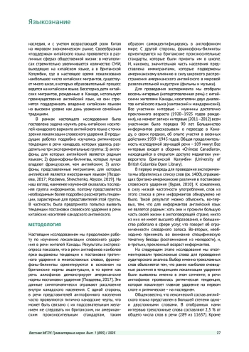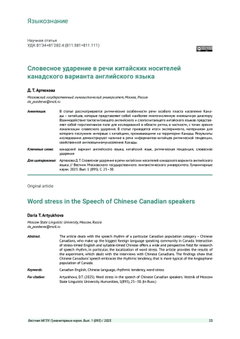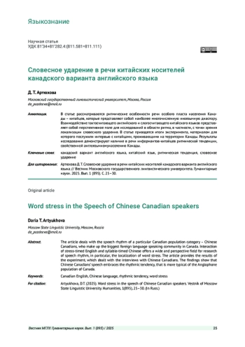 2. Pozdeeva D., Shevchenko T., Abyzov A. New Perspectives on Canadian English Digital Identity Based on Word Stress Patterns in Lexicon and Spoken Corpus // SPECOM 2019, Lecture Notes in Computer Science. LNAI 11658 / Ed. by A. A. Salah et al. Springer Nature Switzerland AG 2019. 2019. P. 401-413. EDN: DGRHHS