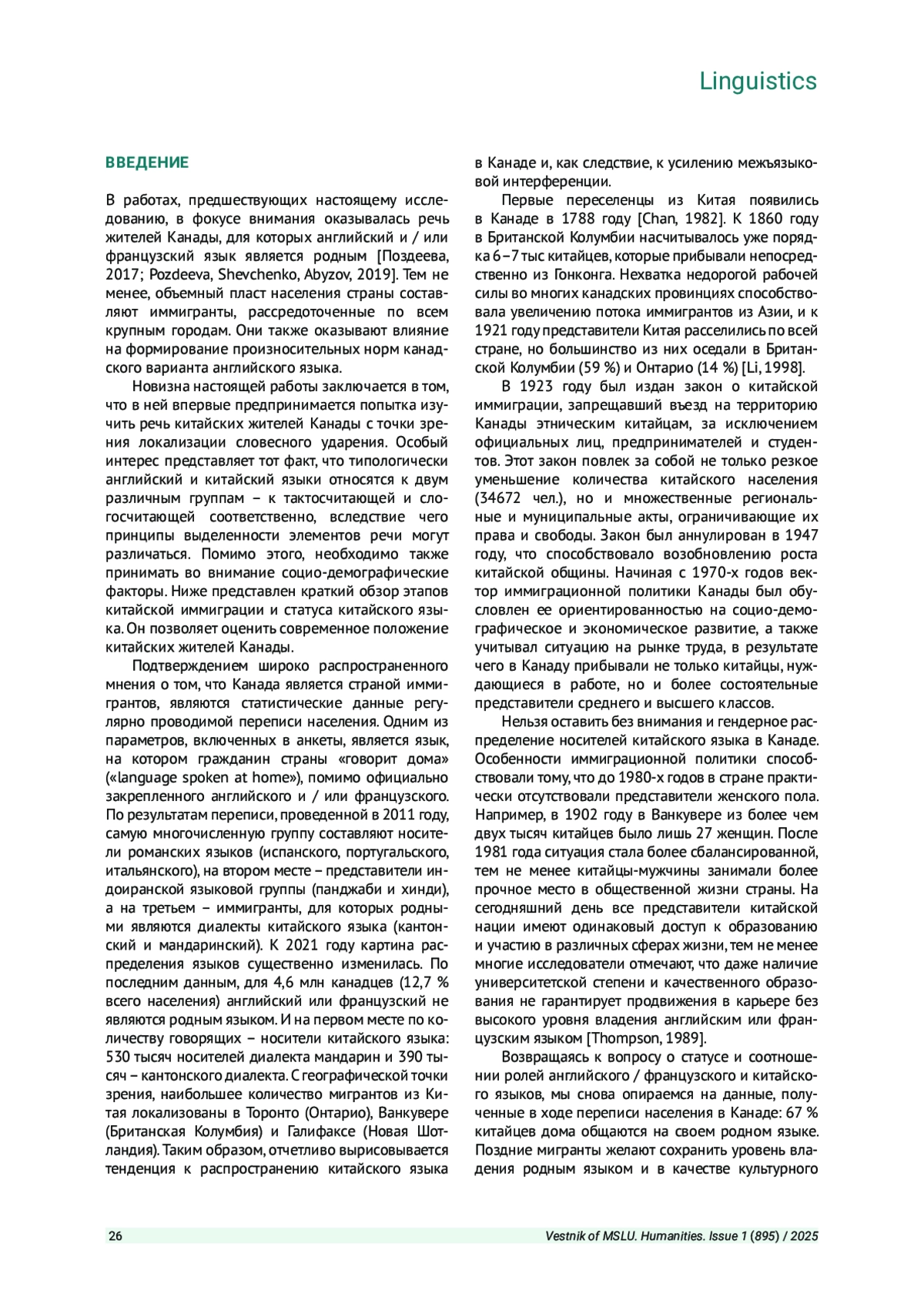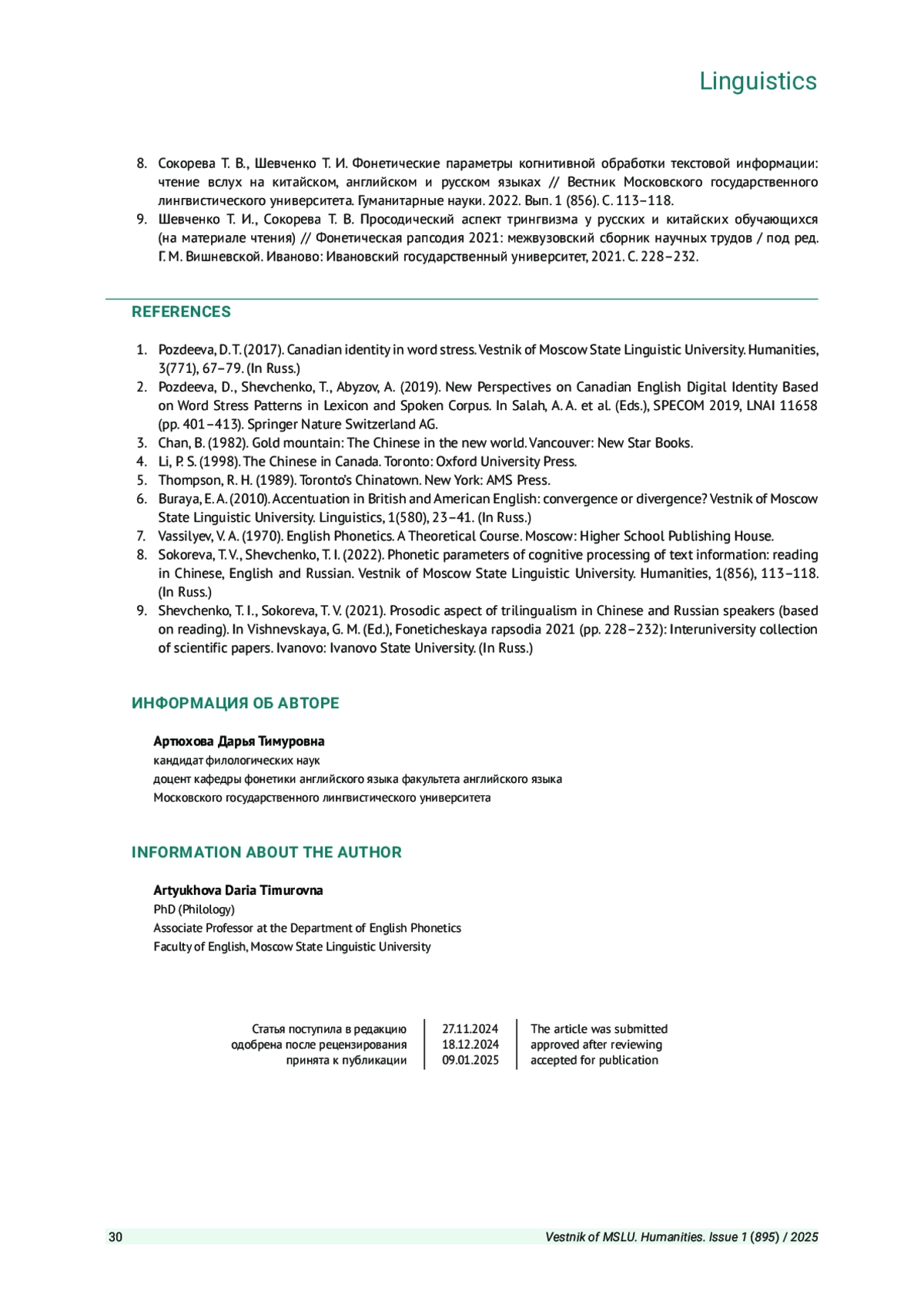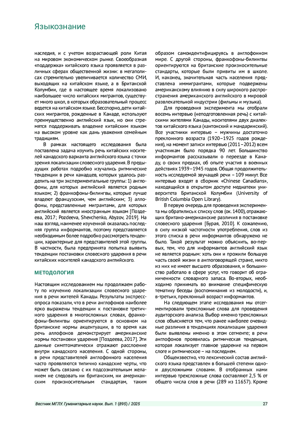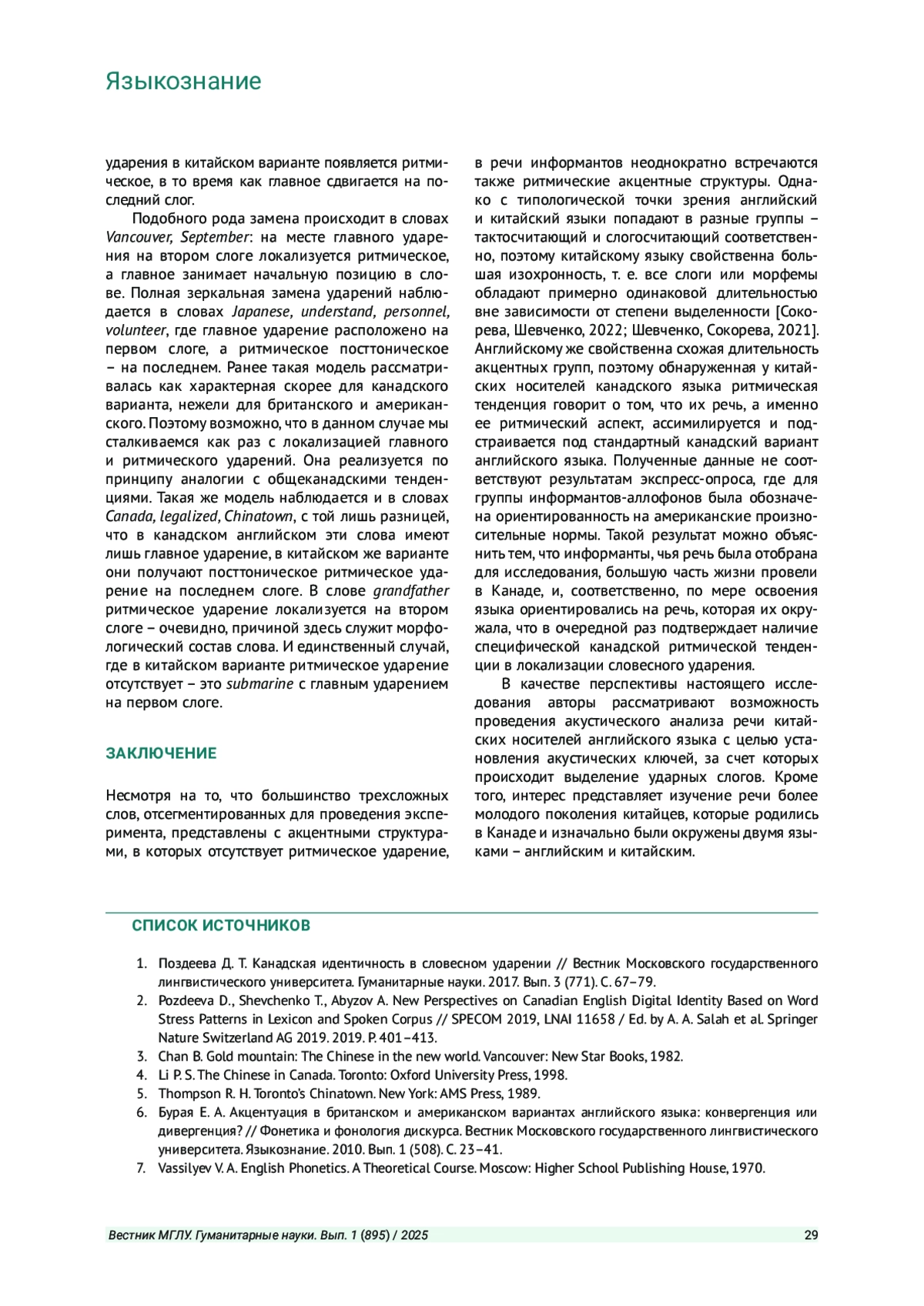 1. Поздеева Д. Т. Канадская идентичность в словесном ударении // Вестник Московского государственного лингвистического университета. Гуманитарные науки. 2017. Вып. 3 (771). С. 67-79. EDN: YPJEJW