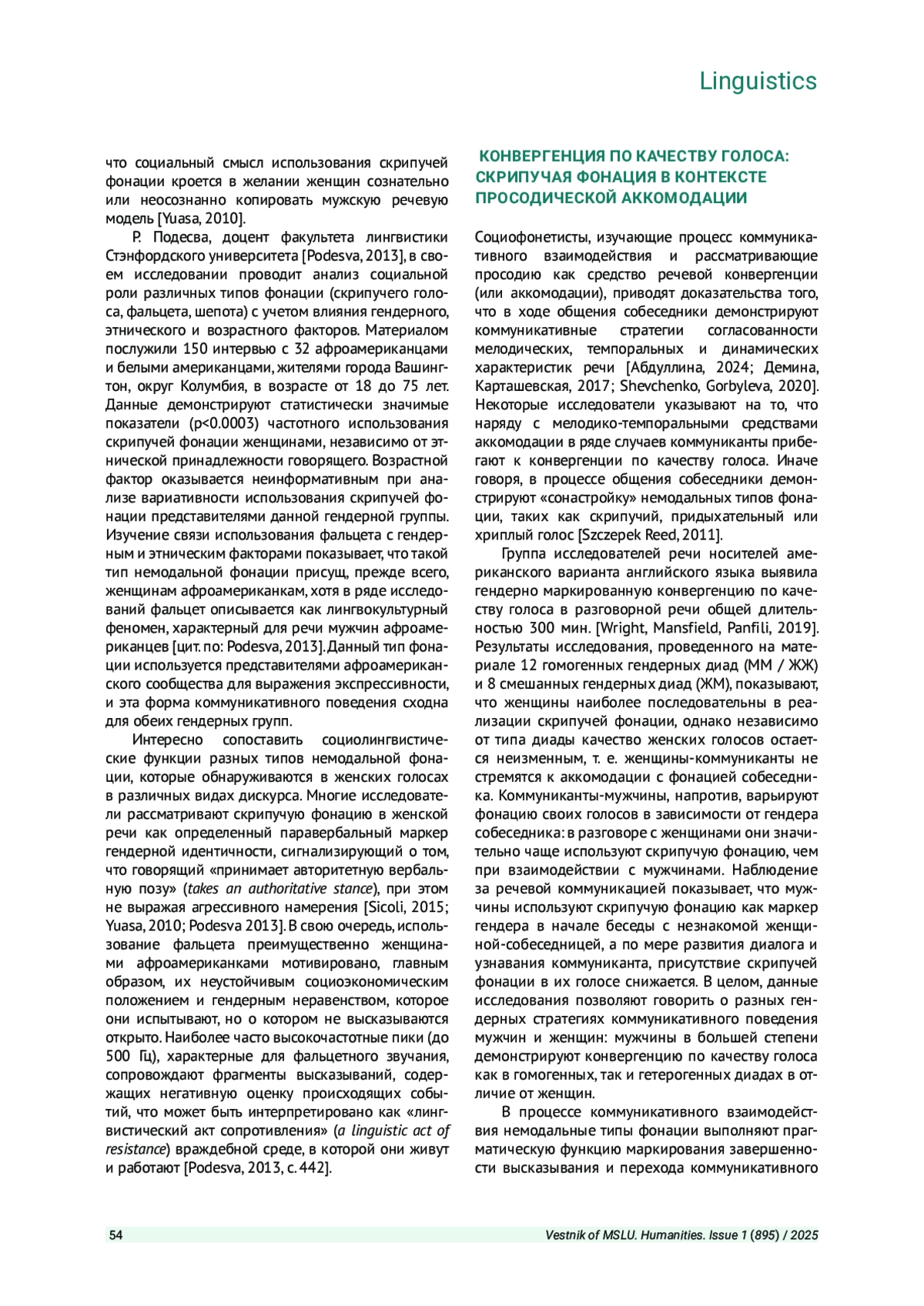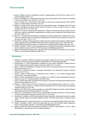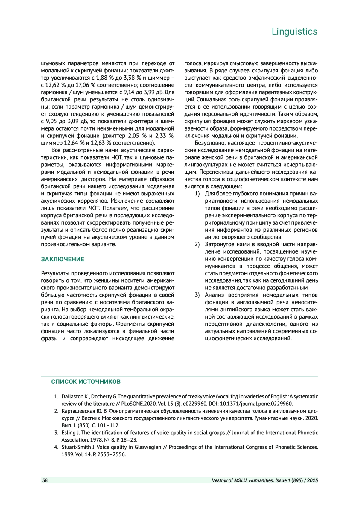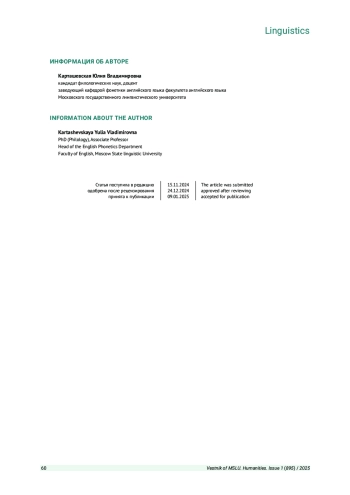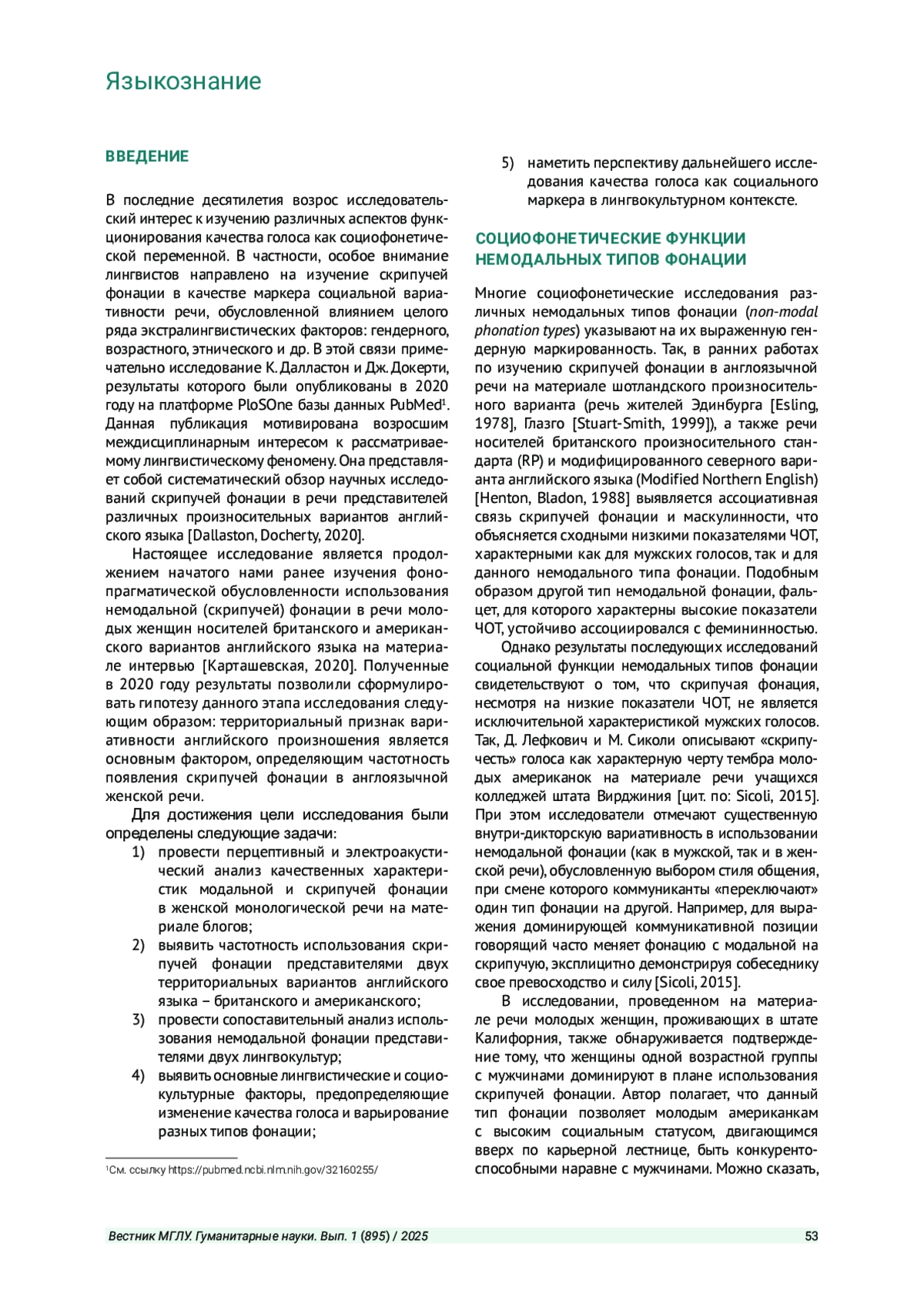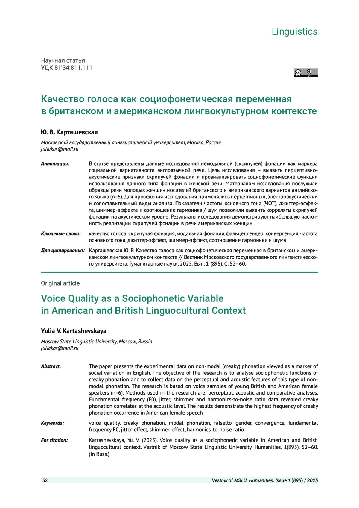 КАРТАШЕВСКАЯ Ю. В. КАЧЕСТВО ГОЛОСА КАК СОЦИОФОНЕТИЧЕСКАЯ ПЕРЕМЕННАЯ В БРИТАНСКОМ И АМЕРИКАНСКОМ ЛИНГВОКУЛЬТУРНОМ КОНТЕКСТЕ // ВЕСТНИК МОСКОВСКОГО ГОСУДАРСТВЕННОГО ЛИНГВИСТИЧЕСКОГО УНИВЕРСИТЕТА. ГУМАНИТАРНЫЕ НАУКИ. 2025. № 1 (895)