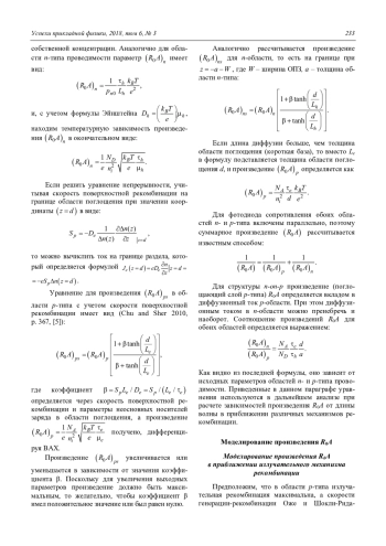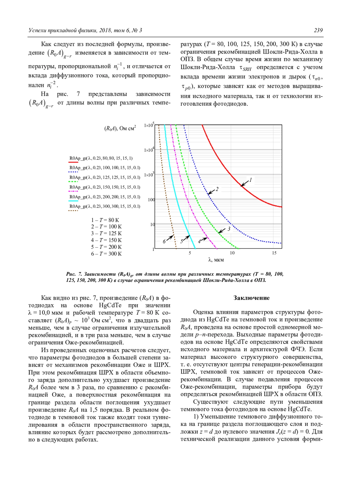 Из решения уравнения непрерывности для одномерной модели р–n-перехода с граничными условиями, определяющими поведение концентрации неосновных носителей заряда и тока на границах раздела областей р- и n-типа проводимости, получена зависимость произведения R0A от длины волны и температуры. Проведено сравнение влияния характерных для материала HgCdTe механизмов рекомбинации (излучательной, поверхностной, Оже, Шокли-Рида-Холла), на параметры фотодиодов. Показано, что параметры фотодиодов в большей степени зависят от механизмов рекомбинации Оже и ШРХ, при этом рекомбинация ШРХ в области объемного заряда дополнительно уменьшает произведение R0A более чем в 3 раза по сравнению с рекомбинацией Оже, а поверхностная рекомбинация на границе раздела области поглощения уменьшает произведение R0A на 1,5 порядка. Предложены рекомендации по улучшению технологии изготовления фотодиодов на основе HgCdTe, которые заключаются в усложнении архитектуры фоточувствительного элемента (ФЧЭ) и улучшение качества границ раздела между слоями.