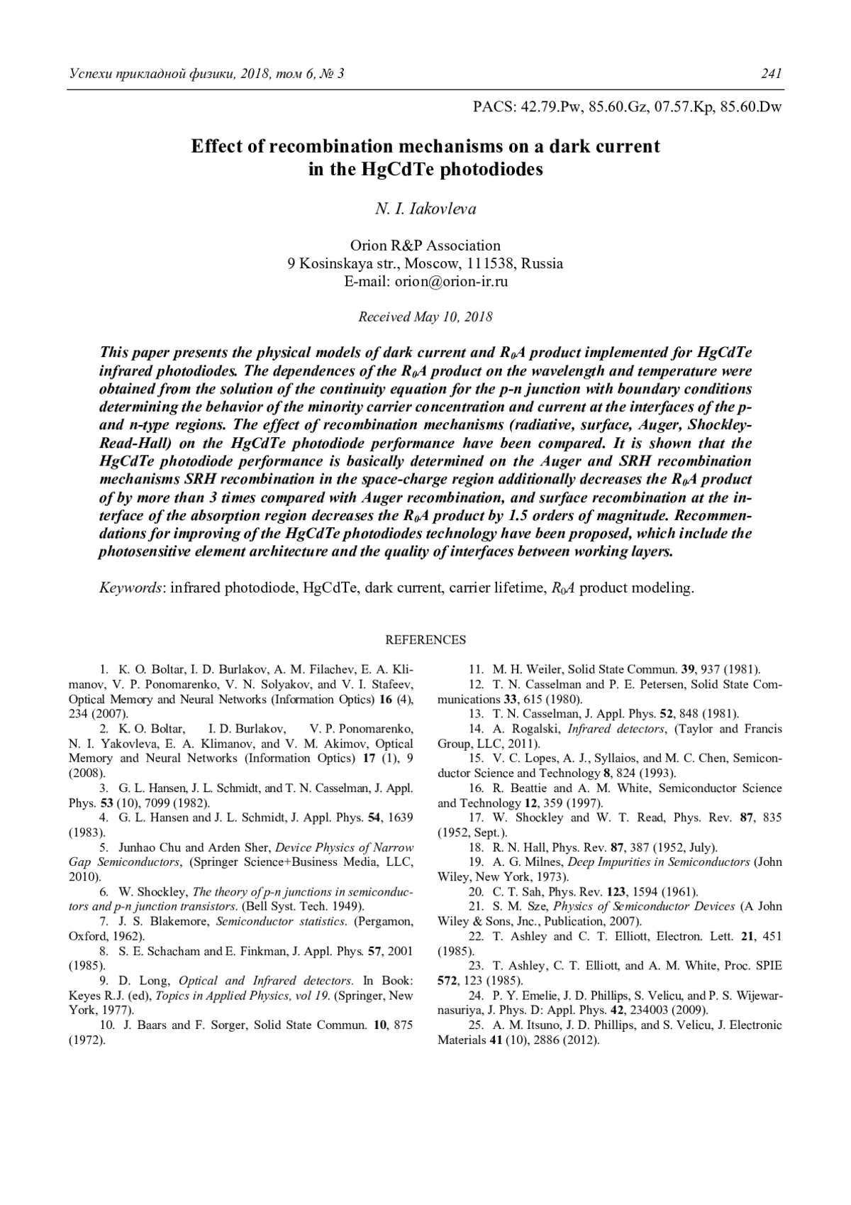 Ключевые фразы: ик-фотодиоды, HgCdTe, темновой ток, время жизни, моделирование произведения r0a