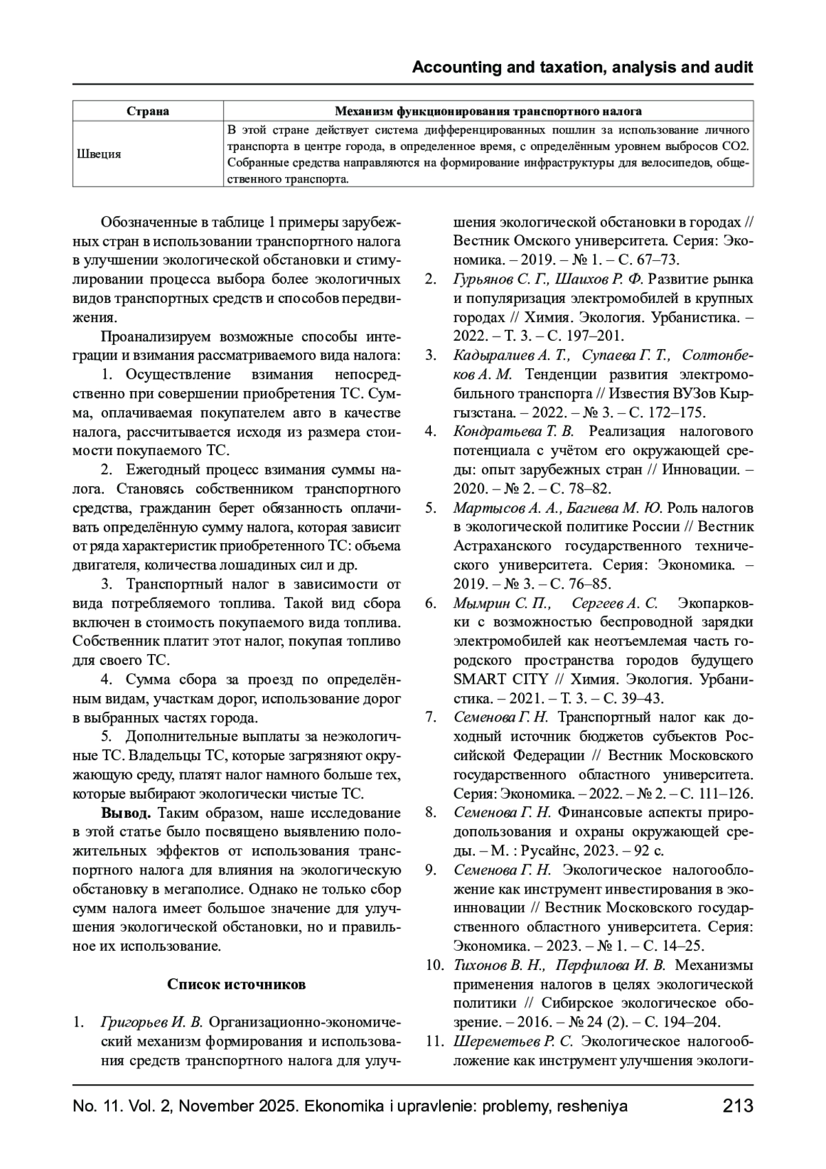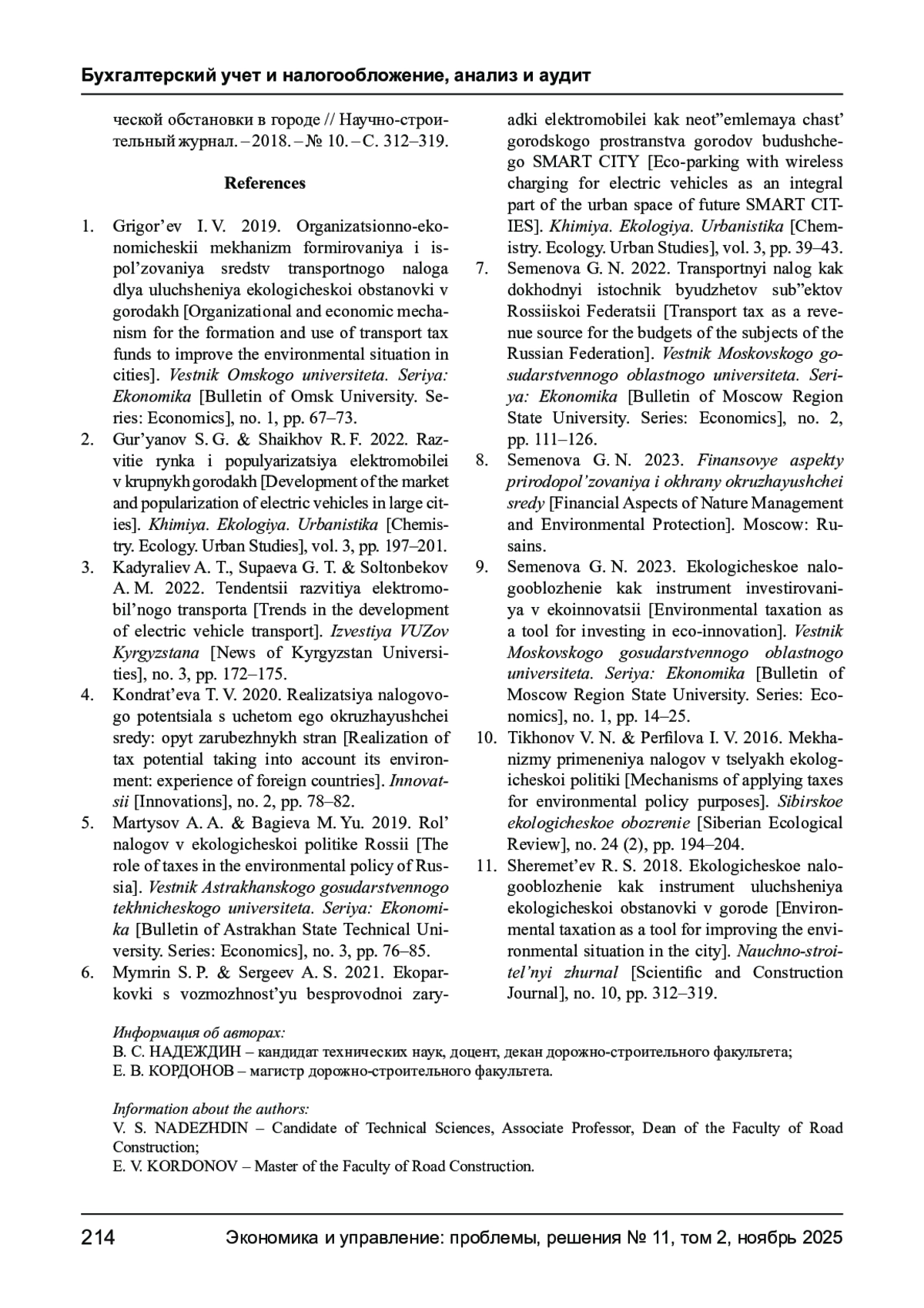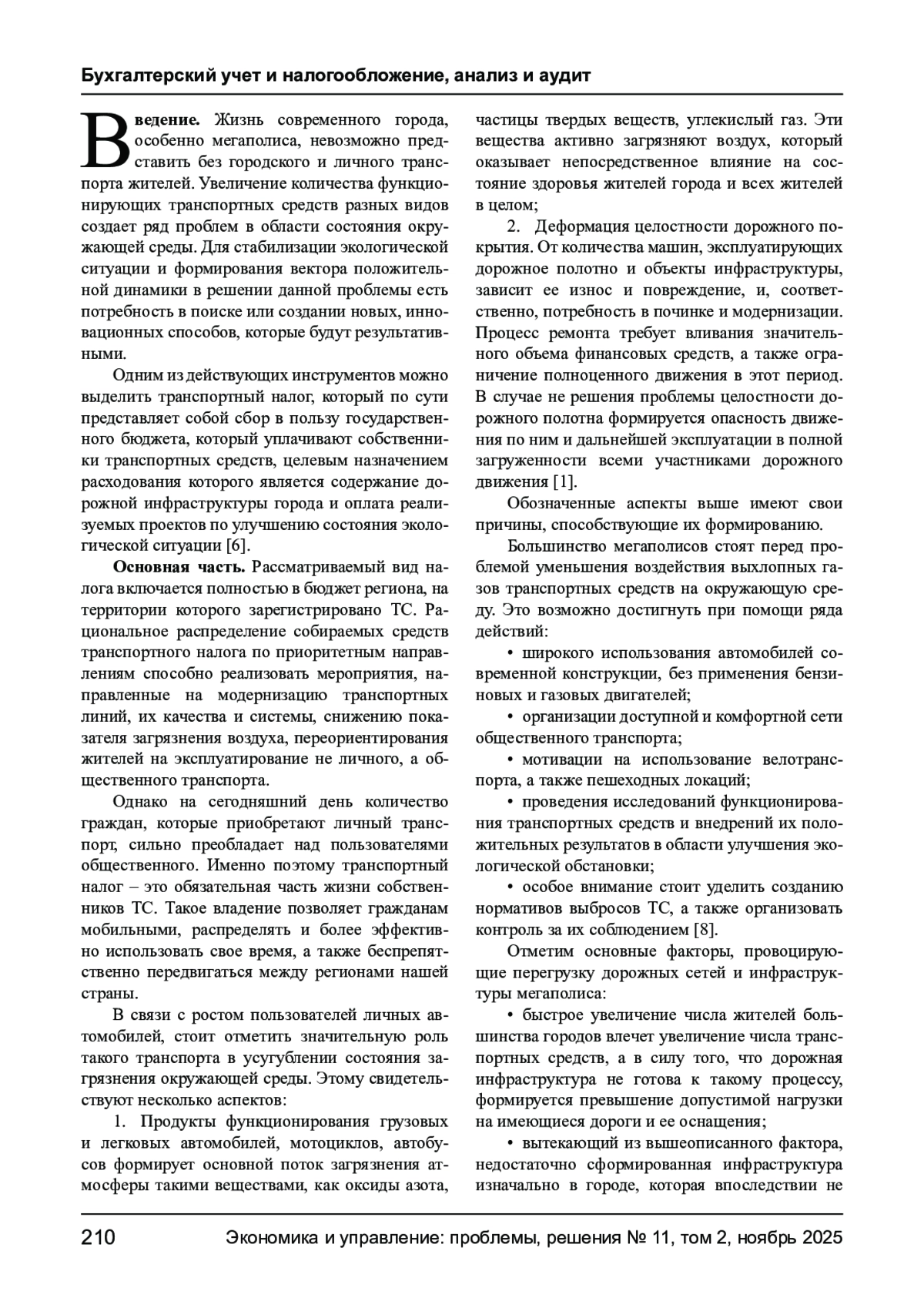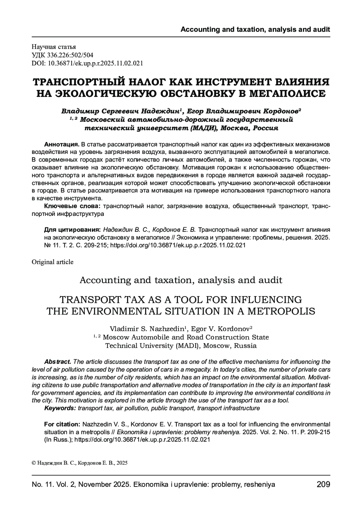 НАДЕЖДИН В. С., КОРДОНОВ Е. В. ТРАНСПОРТНЫЙ НАЛОГ КАК ИНСТРУМЕНТ ВЛИЯНИЯ НА ЭКОЛОГИЧЕСКУЮ ОБСТАНОВКУ В МЕГАПОЛИСЕ // ЭКОНОМИКА И УПРАВЛЕНИЕ: ПРОБЛЕМЫ, РЕШЕНИЯ. 2025. ТОМ 2 № 11