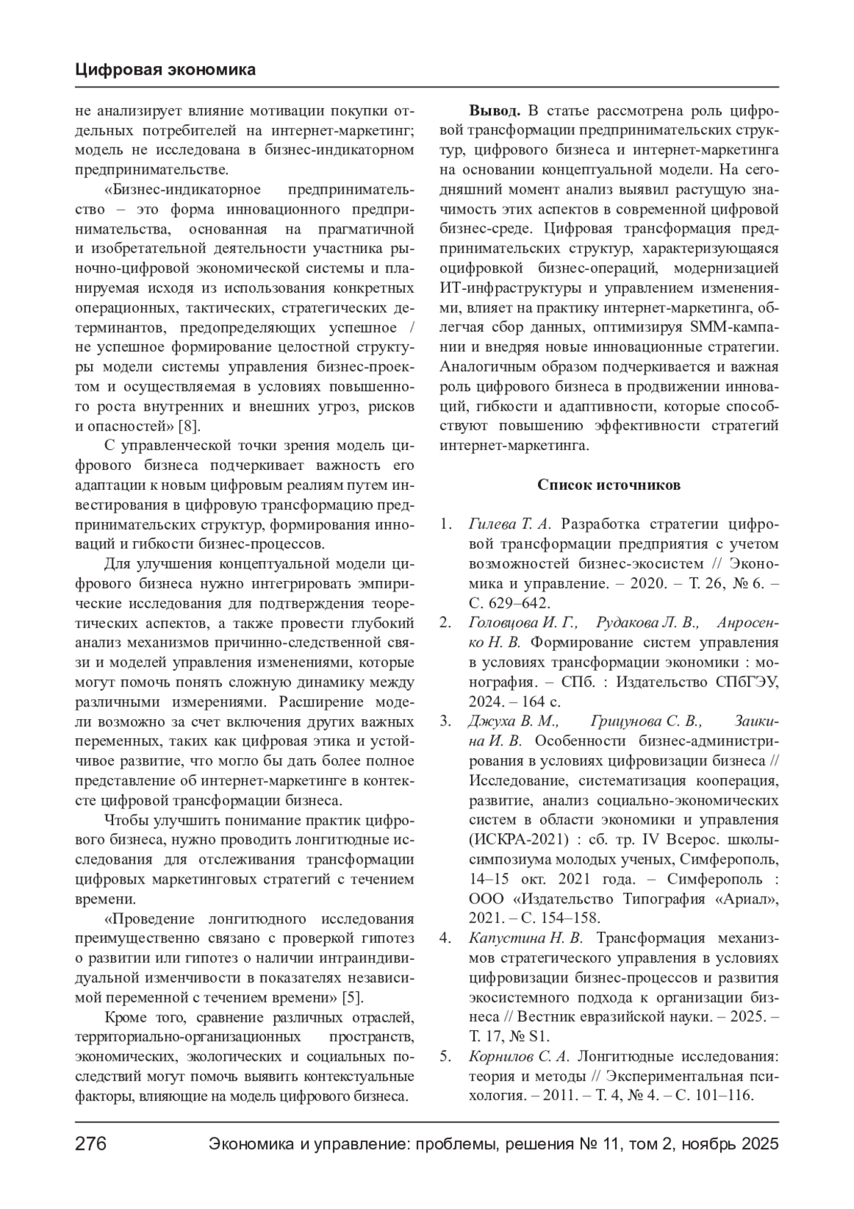 4. Капустина Н. В. Трансформация механизмов стратегического управления в условиях цифровизации бизнес-процессов и развития экосистемного подхода к организации бизнеса // Вестник евразийской науки. - 2025. - Т. 17, № S1. EDN: JNKELK