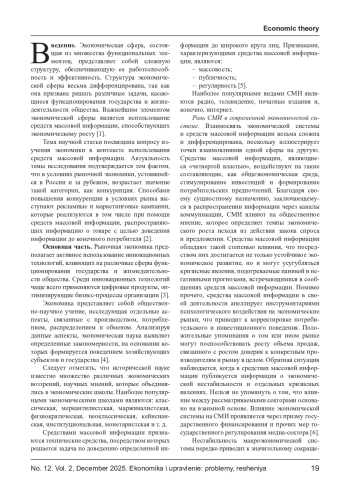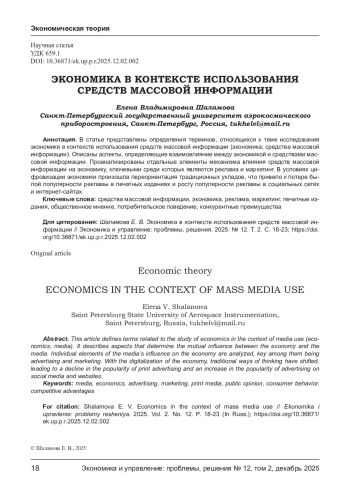 В статье представлены определения терминов, относящихся к теме исследования экономики в контексте использования средств массовой информации (экономика; средства массовой информации). Описаны аспекты, определяющие взаимовлияние между экономикой и средствами массовой информации. Проанализированы отдельные элементы механизма влияния средств массовой информации на экономику, ключевыми среди которых являются реклама и маркетинг. В условиях цифровизации экономики произошла переориентация традиционных укладов, что привело к потере былой популярности рекламы в печатных изданиях и росту популярности рекламы в социальных сетях и интернет-сайтах.