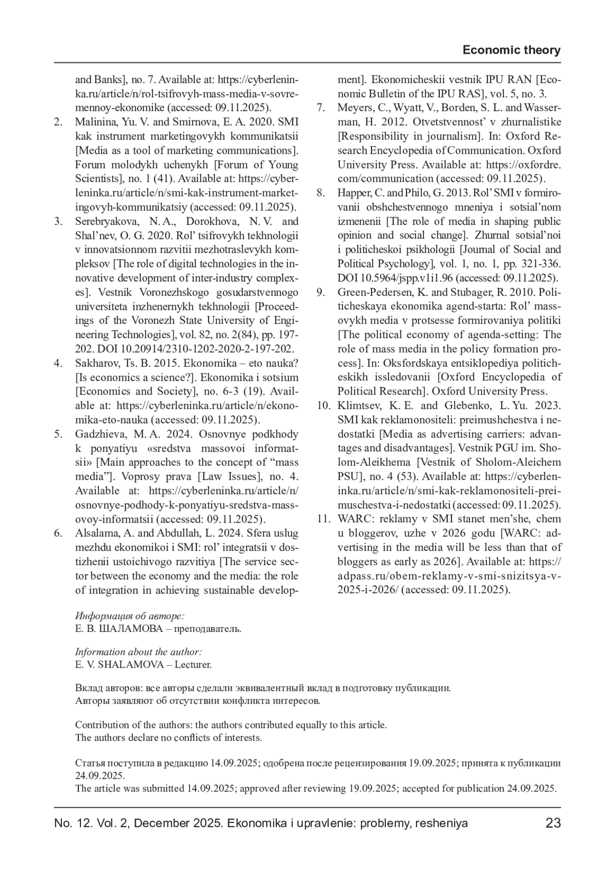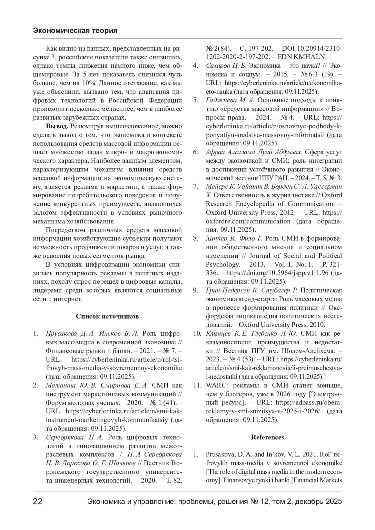 1. Прусакова Д. А. Иньков В. Л. Роль цифровых масс-медиа в современной экономике // Финансовые рынки и банки. - 2021. - № 7. - URL: https://cyberleninka.ru/article/n/rol-tsifrovyh-mass-media-v-sovremennoy-ekonomike (дата обращения: 09.11.2025).