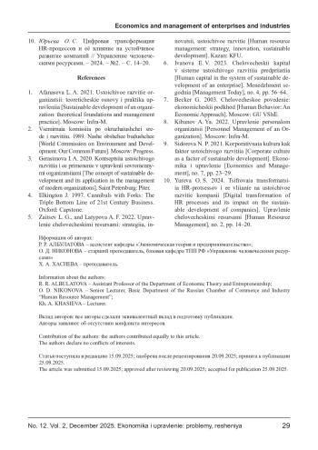 10. Юрьева О. С. Цифровая трансформация HR-процессов и её влияние на устойчивое развитие компаний // Управление человеческими ресурсами. - 2024. - №2. - С. 14-20.