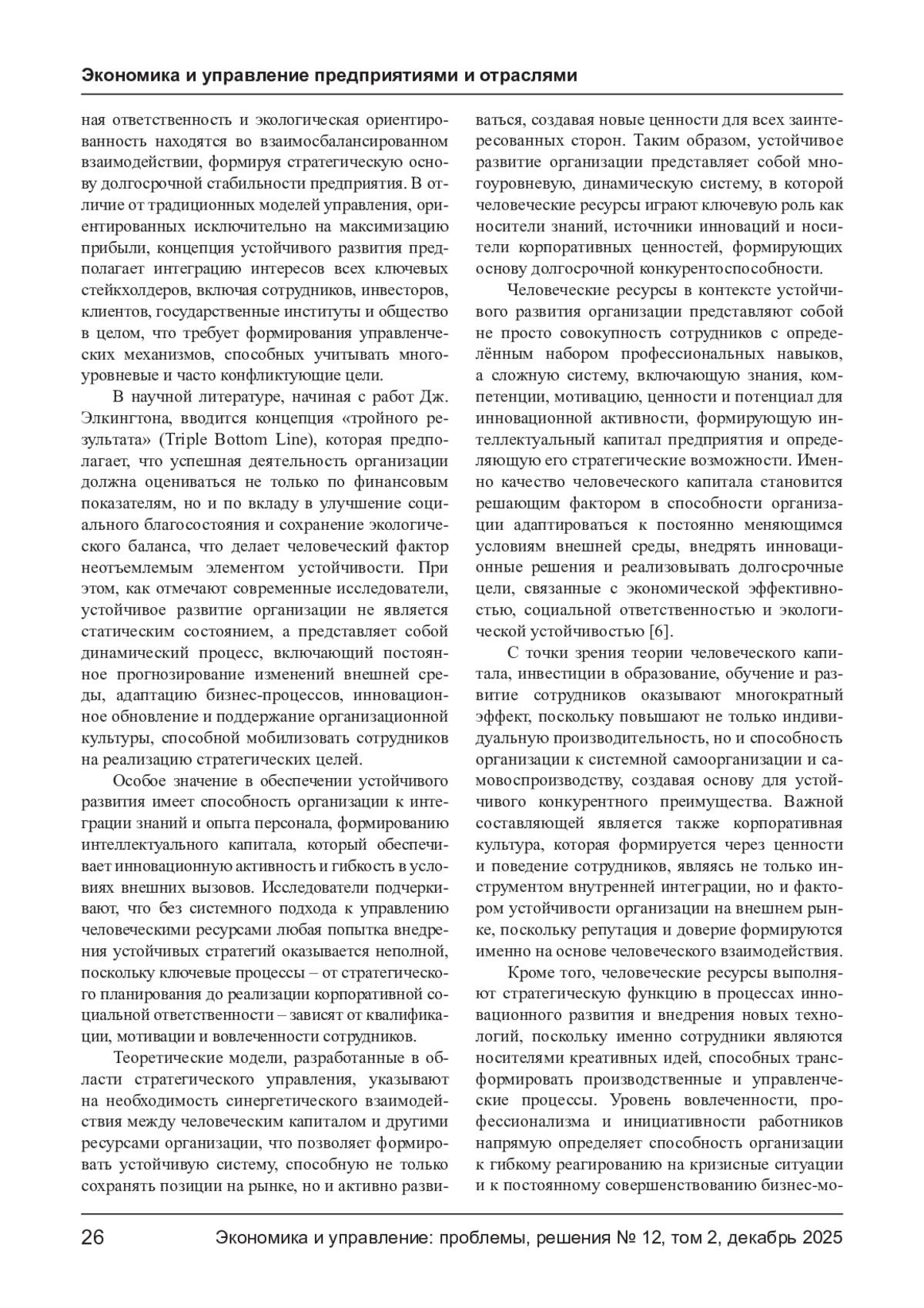 Современный этап развития мировой экономики характеризуется глубинными структурными преобразованиями, обусловленными глобализацией, цифровизацией и возрастающим вниманием к вопросам экологической и социальной ответственности бизнеса, что делает проблему устойчивого развития одной из ключевых в теории и практике управления организациями [1].