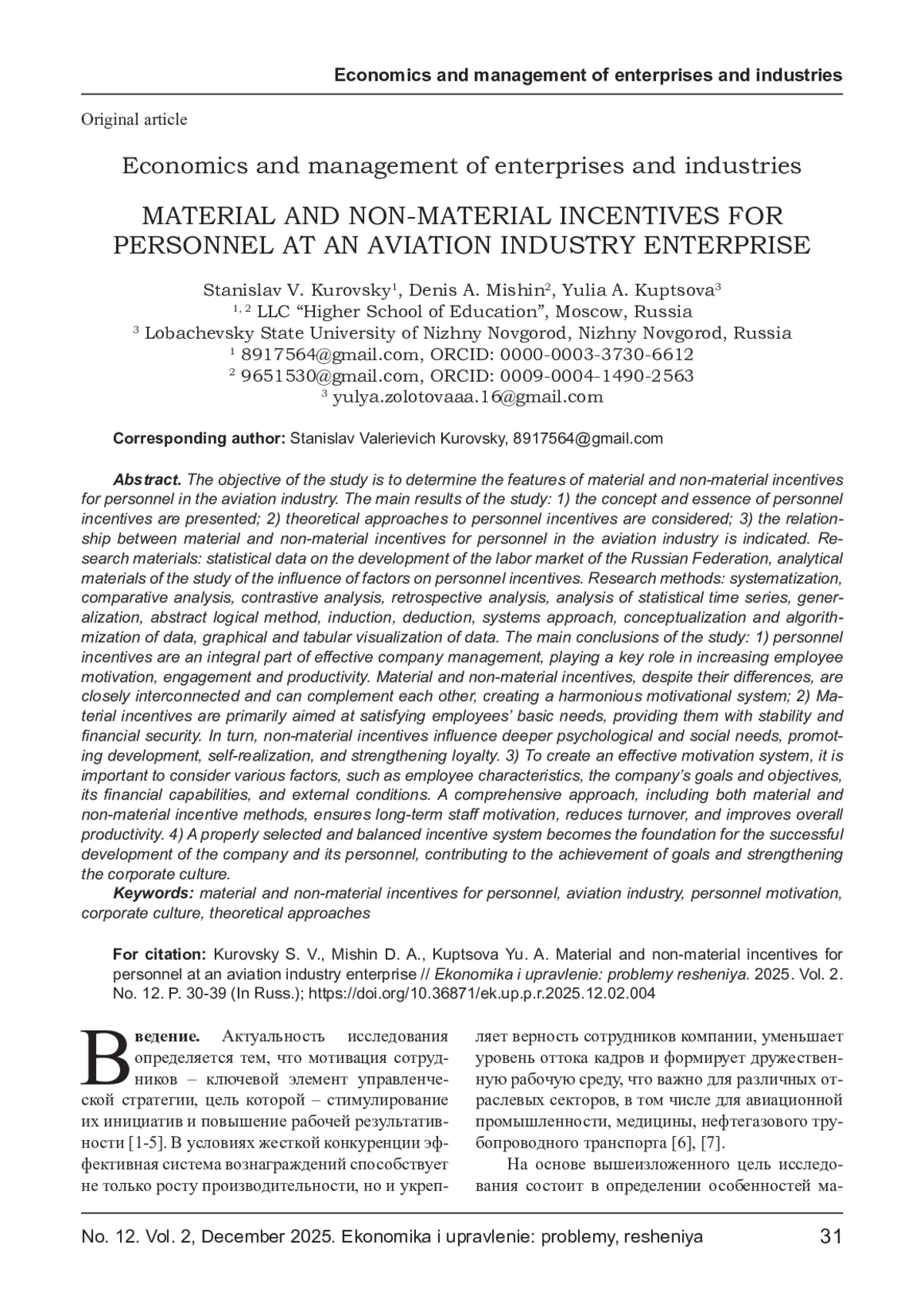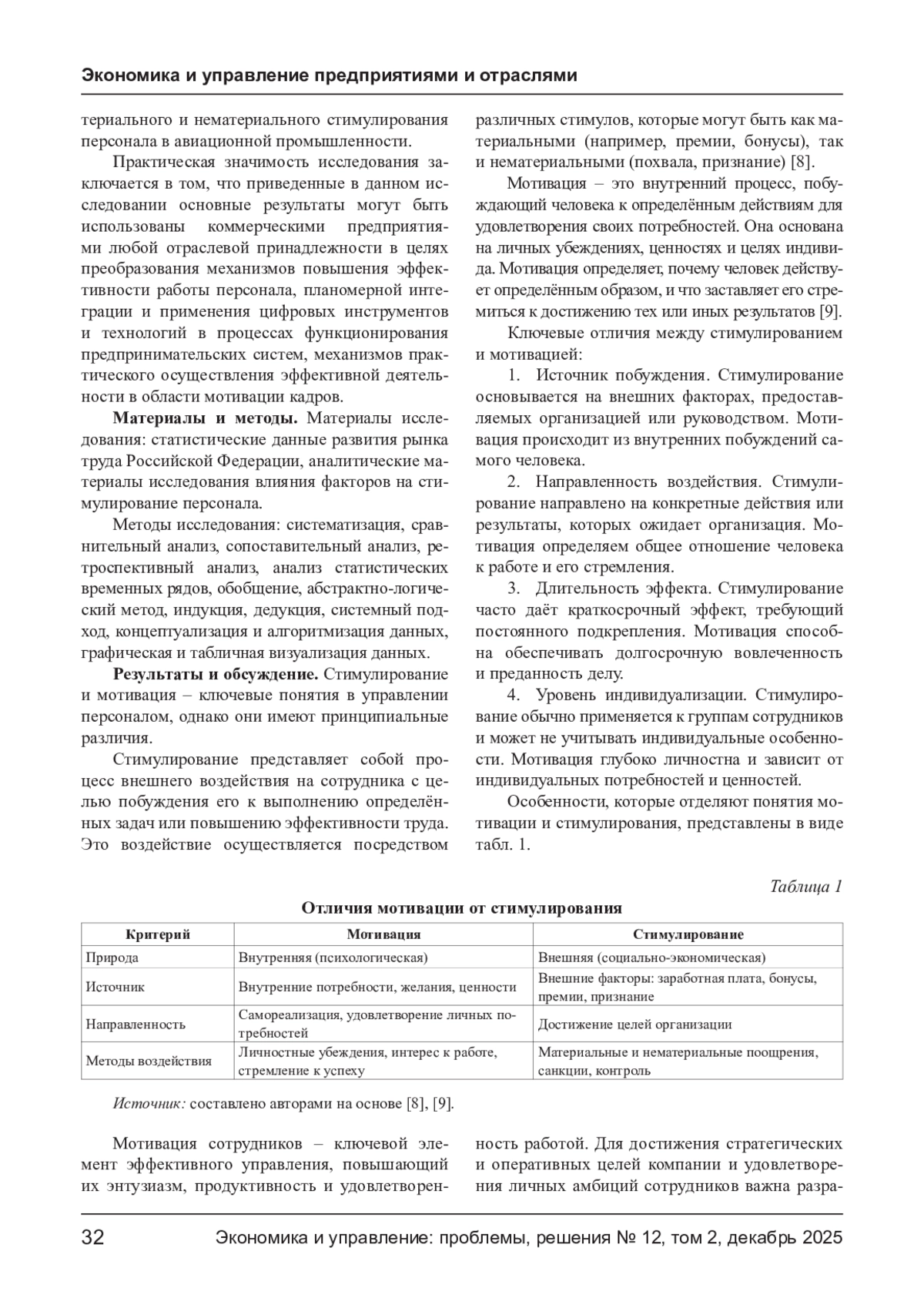 Методы исследования: систематизация, сравнительный анализ, сопоставительный анализ, ретроспективный анализ, анализ статистических временных рядов, обобщение, абстрактно-логический метод, индукция, дедукция, системный подход, концептуализация и алгоритмизация данных, графическая и табличная визуализация данных. Основные выводы исследования: 1) стимулирование персонала является неотъемлемой частью эффективного управления компанией, играя ключевую роль в повышении мотивации сотрудников, их вовлечённости и производительности. Материальные и нематериальные стимулы, несмотря на свои различия, тесно взаимосвязаны и могут взаимодополнять друг друга, создавая гармоничную мотивационную систему; 2) материальное стимулирование в первую очередь направлено на удовлетворение базовых потребностей сотрудников, обеспечивая им стабильность и финансовую безопасность. В свою очередь, нематериальные стимулы воздействуют на более глубокие психологические и социальные потребности, способствуя развитию, самореализации и укреплению лояльности; 3) для создания эффективной системы мотивации важно учитывать различные факторы, такие как характеристики сотрудников, цели и задачи компании, её финансовые возможности и внешние условия. Комплексный подход, включающий как материальные, так и нематериальные методы стимулирования, позволяет обеспечить долгосрочную мотивацию персонала, уменьшить текучесть кадров и повысить общую производительность; 4) правильно выбранная и сбалансированная система стимулирования становится основой для успешного развития компании и её персонала, способствуя достижению поставленных целей и укреплению корпоративной культуры.