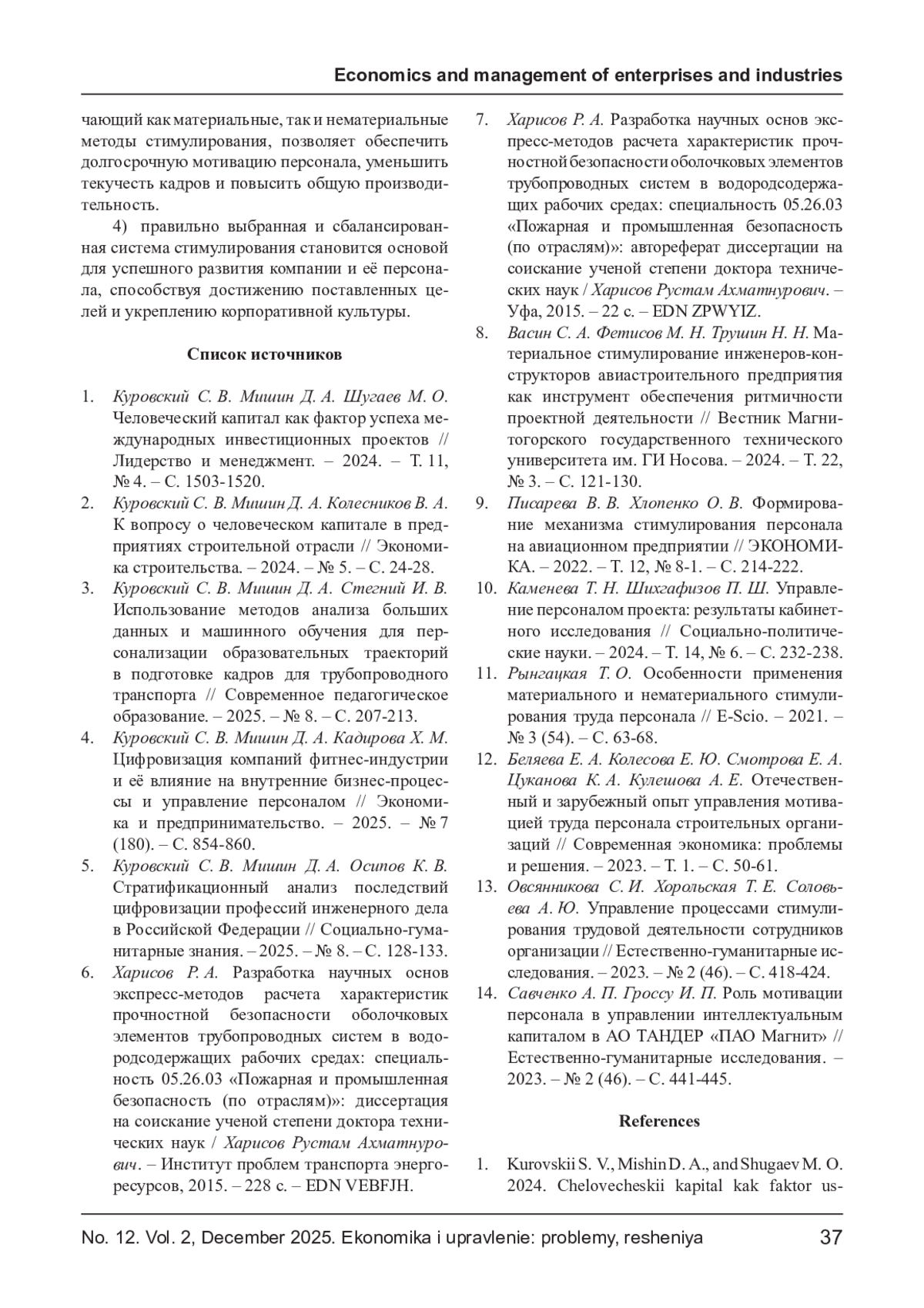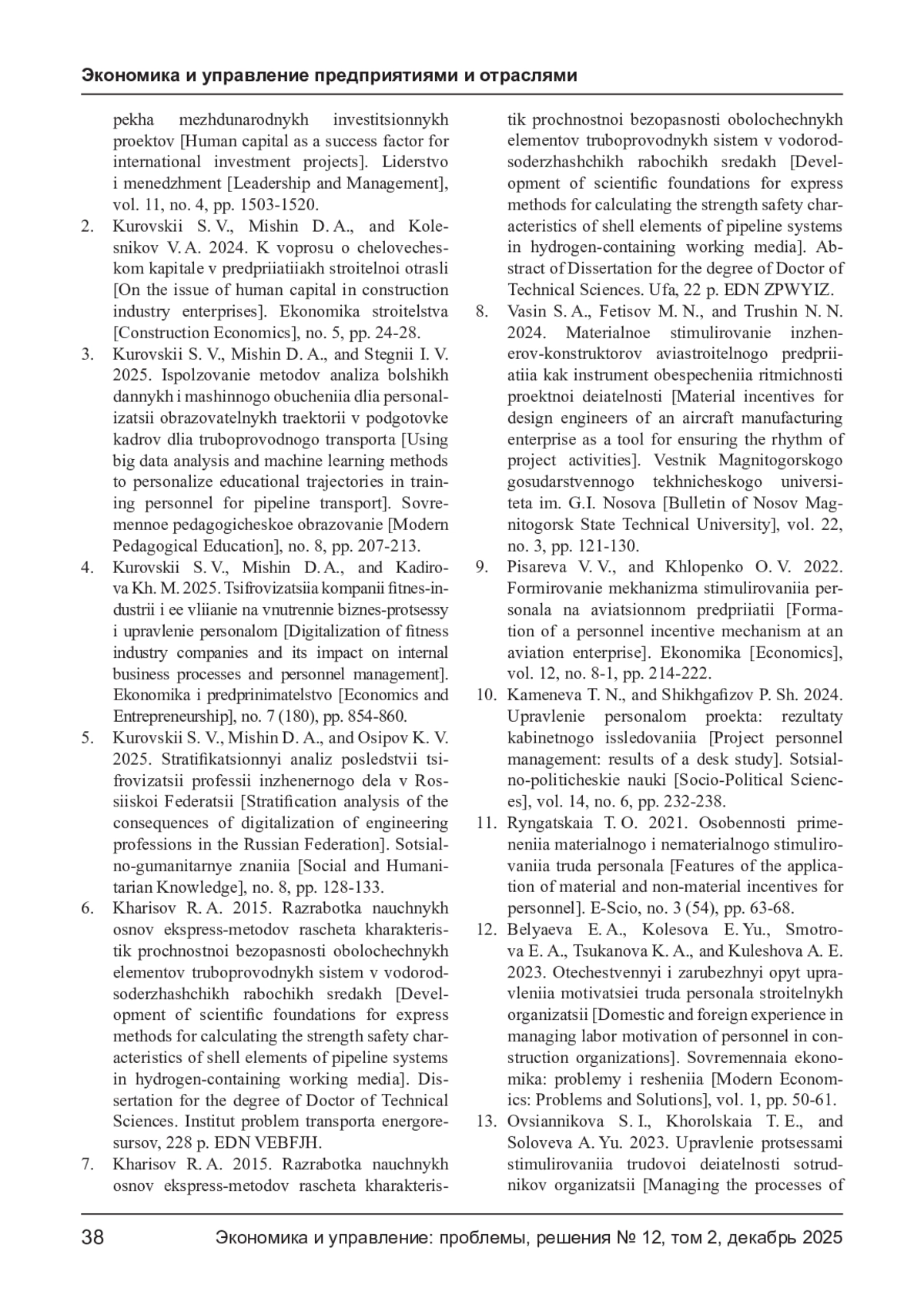 2. Куровский С. В. Мишин Д. А. Колесников В. А. К вопросу о человеческом капитале в предприятиях строительной отрасли // Экономика строительства. - 2024. - № 5. - С. 24-28.