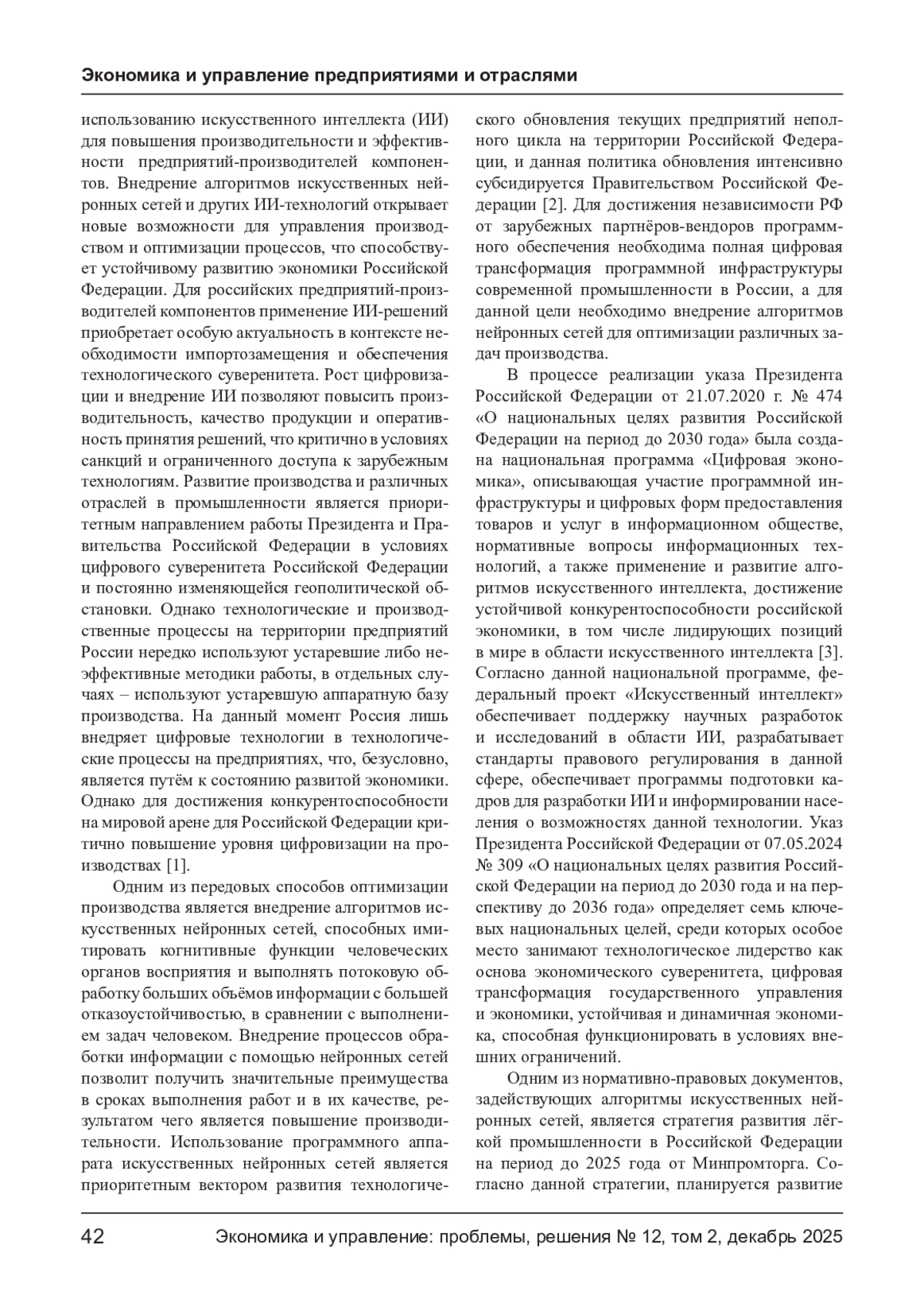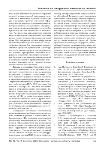 Статья: АНАЛИЗ СОВРЕМЕННЫХ ТЕХНОЛОГИЙ УПРАВЛЕНИЯ ПРЕДПРИЯТИЯМИ-ПРОИЗВОДИТЕЛЯМИ КОМПОНЕНТОВ НА ОСНОВЕ ПРИМЕНЕНИЯ ИСКУССТВЕННОГО ИНТЕЛЛЕКТА (2025)