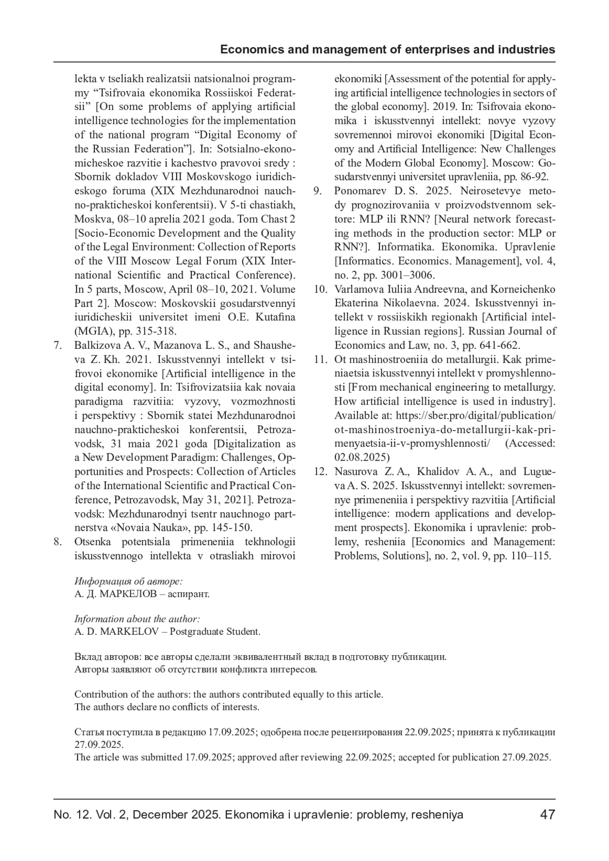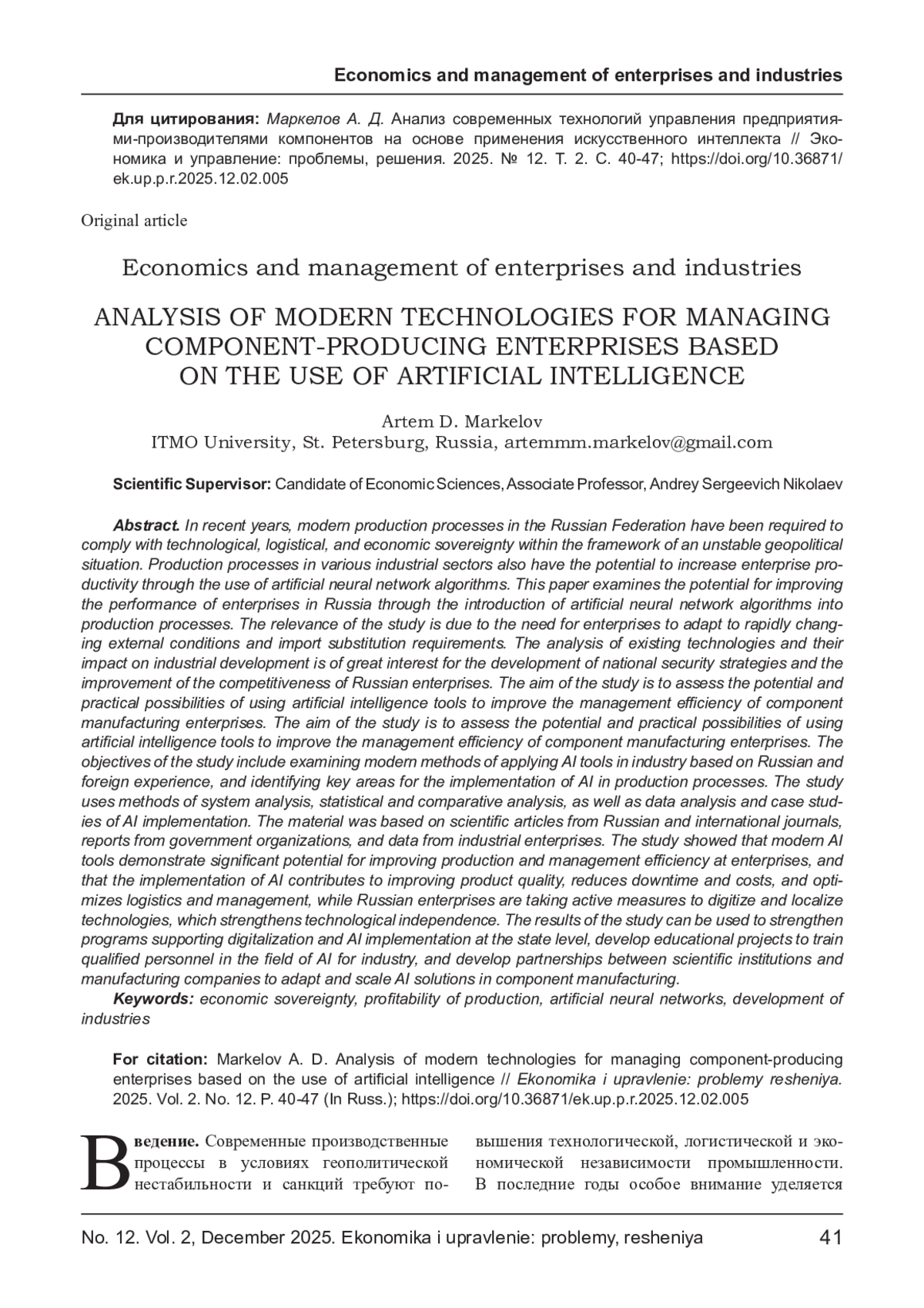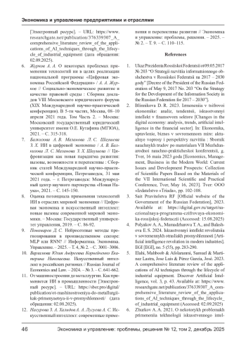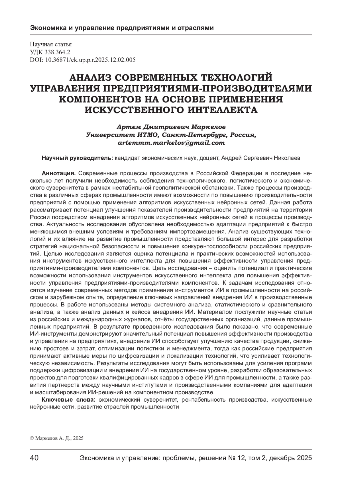 МАРКЕЛОВ А. Д. АНАЛИЗ СОВРЕМЕННЫХ ТЕХНОЛОГИЙ УПРАВЛЕНИЯ ПРЕДПРИЯТИЯМИ-ПРОИЗВОДИТЕЛЯМИ КОМПОНЕНТОВ НА ОСНОВЕ ПРИМЕНЕНИЯ ИСКУССТВЕННОГО ИНТЕЛЛЕКТА // ЭКОНОМИКА И УПРАВЛЕНИЕ: ПРОБЛЕМЫ, РЕШЕНИЯ. 2025. ТОМ 12 № 2