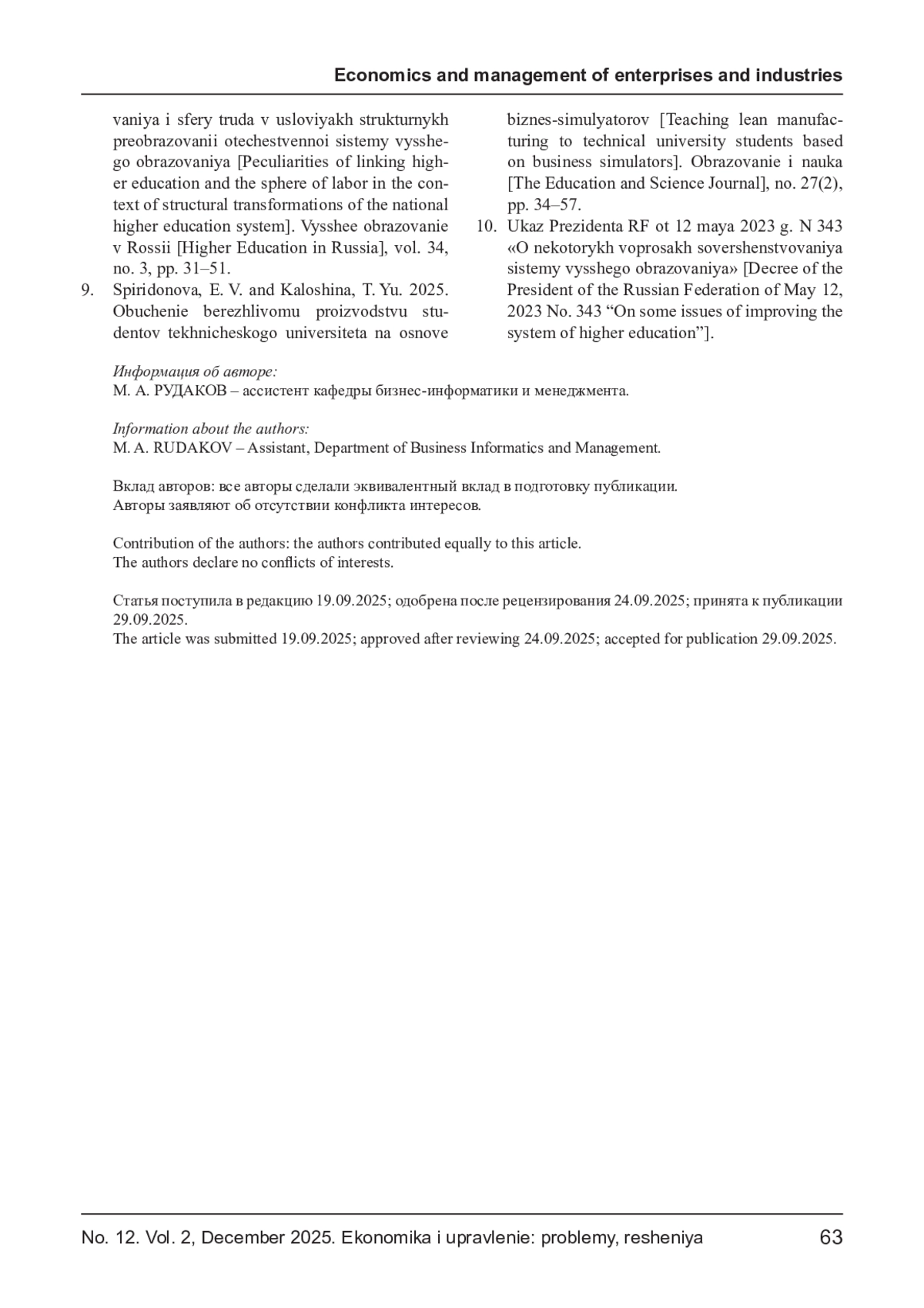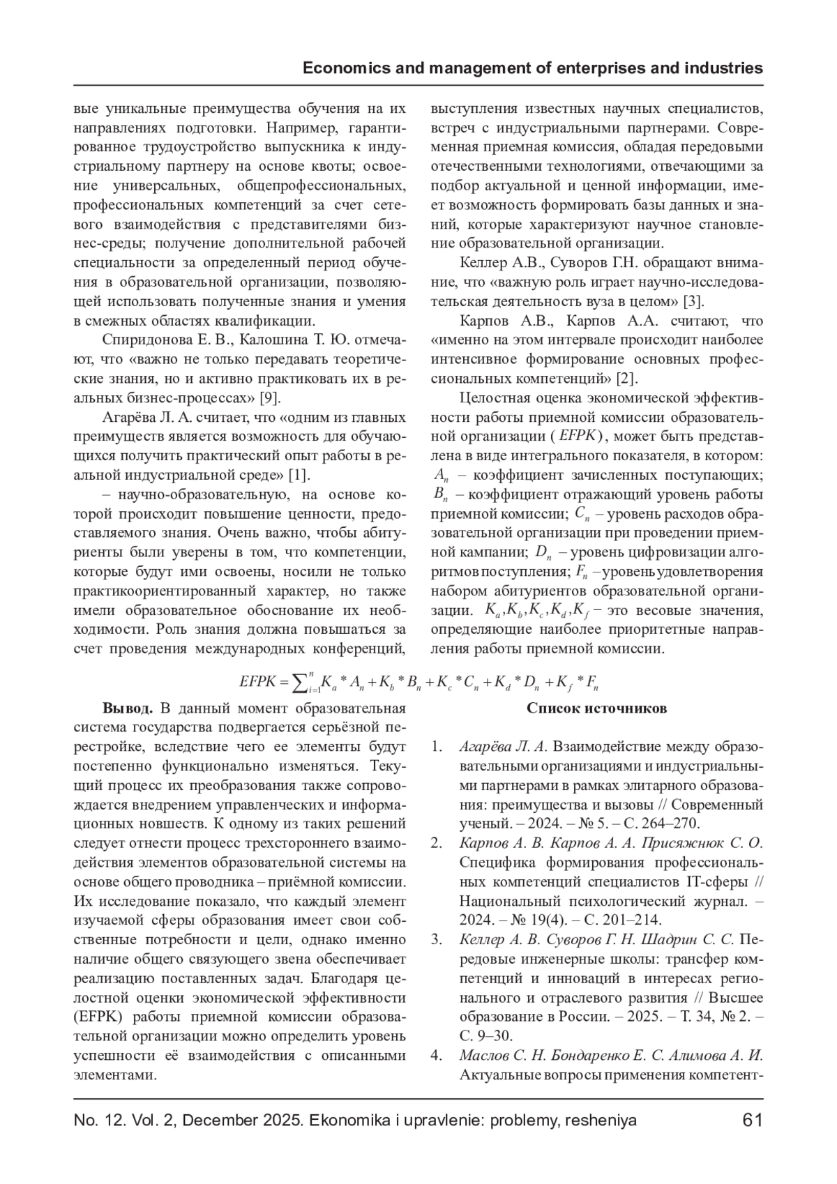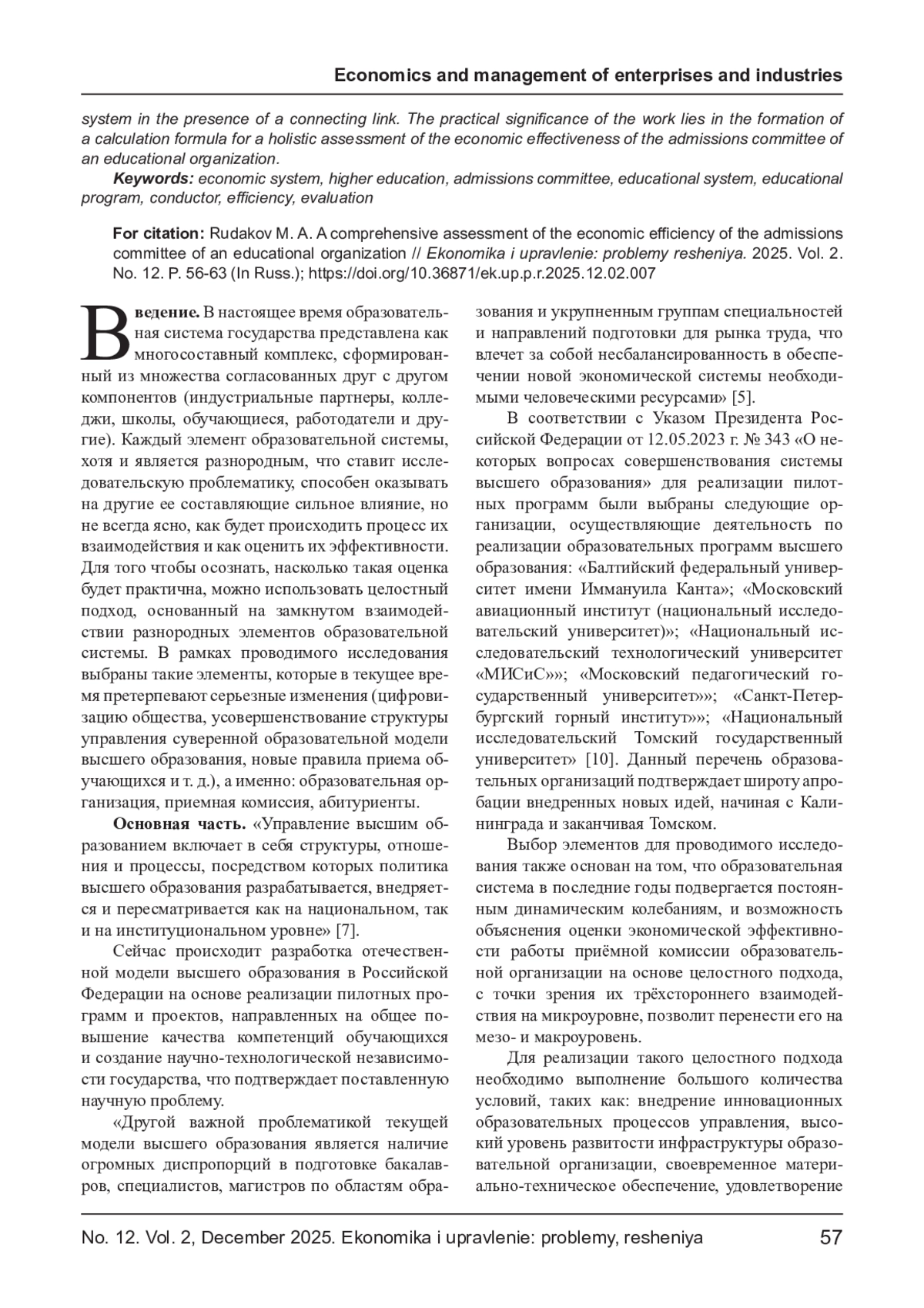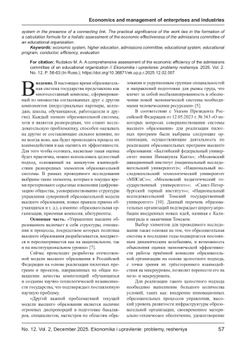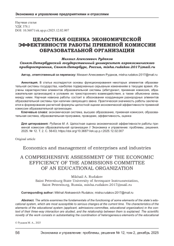 РУДАКОВ М. А. ЦЕЛОСТНАЯ ОЦЕНКА ЭКОНОМИЧЕСКОЙ ЭФФЕКТИВНОСТИ РАБОТЫ ПРИЕМНОЙ КОМИССИИ ОБРАЗОВАТЕЛЬНОЙ ОРГАНИЗАЦИИ // ЭКОНОМИКА И УПРАВЛЕНИЕ: ПРОБЛЕМЫ, РЕШЕНИЯ. 2025. ТОМ 12 № 2