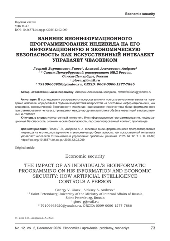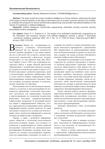 В исследовании раскрываются вопросы влияния искусственного интеллекта на поведение человека, определяется глубина воздействия нейросетей на состояние информационной и, как следствие, экономической безопасности индивида, оцениваются перспективы биоинформационного программирования человека, приводится международная статистика объёма инвестиций в искусственный интеллект.