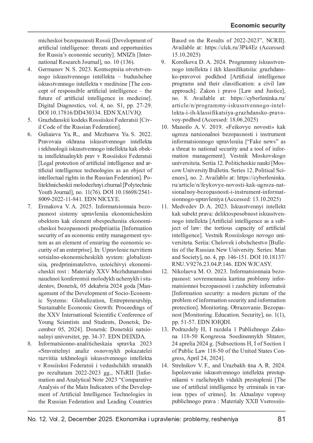 3. Балашов А. А. Развитие искусственного интеллекта: угрозы и возможности для экономической безопасности России // МНИЖ. - 2023. - № 10 (136).
