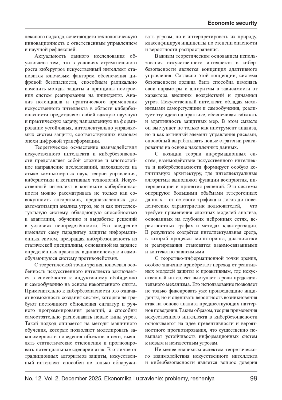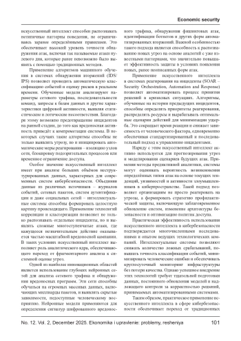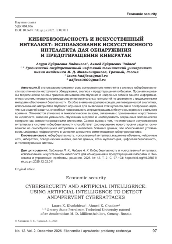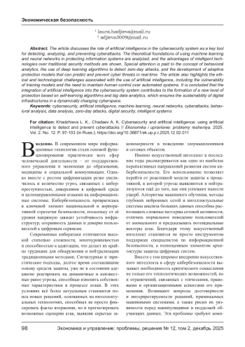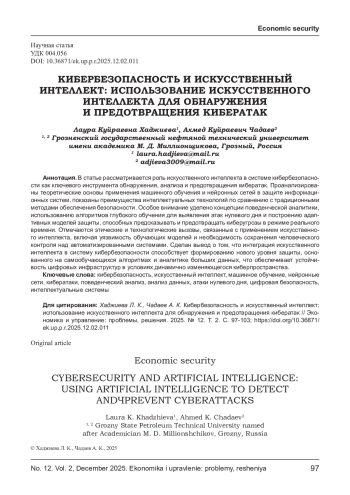 В статье рассматривается роль искусственного интеллекта в системе кибербезопасности как ключевого инструмента обнаружения, анализа и предотвращения кибератак. Проанализированы теоретические основы применения машинного обучения и нейронных сетей в защите информационных систем, показаны преимущества интеллектуальных технологий по сравнению с традиционными методами обеспечения безопасности. Особое внимание уделено концепции поведенческой аналитики, использованию алгоритмов глубокого обучения для выявления атак нулевого дня и построению адаптивных моделей защиты, способных предсказывать и предотвращать киберугрозы в режиме реального времени. Отмечаются этические и технологические вызовы, связанные с применением искусственного интеллекта, включая уязвимость обучающих моделей и необходимость сохранения человеческого контроля над автоматизированными системами. Сделан вывод о том, что интеграция искусственного интеллекта в систему кибербезопасности способствует формированию нового уровня защиты, основанного на самообучающихся алгоритмах и аналитике больших данных, что обеспечивает устойчивость цифровых инфраструктур в условиях динамично изменяющегося киберпространства.