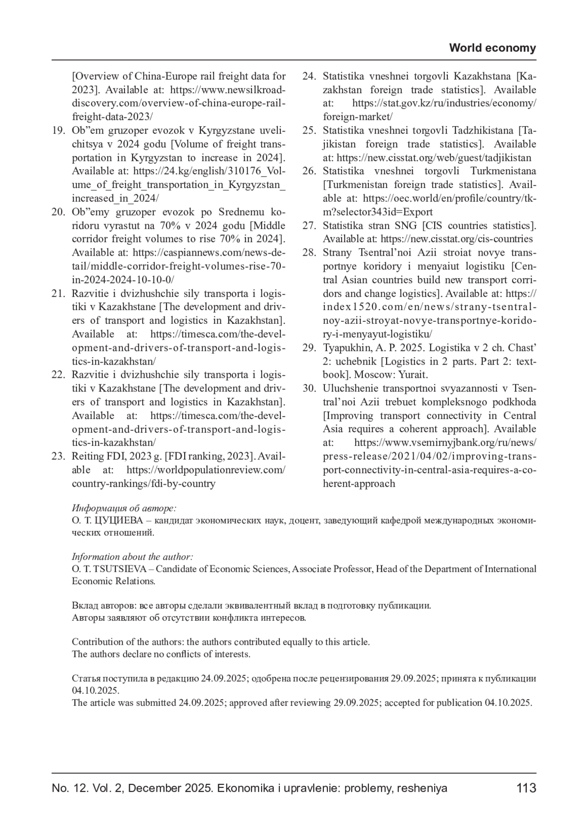 20. Объемы грузоперевозок по Среднему коридору вырастут на 70% в 2024 году [Электронный ресурс]. - URL: https://caspiannews.com/news-detail/middle-corridor-freight-volumesrise-70-in-2024-2024-10-10-0/.