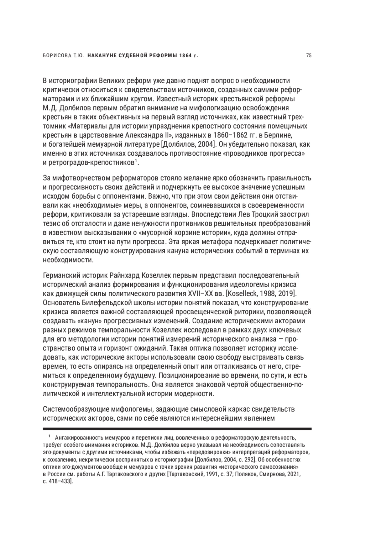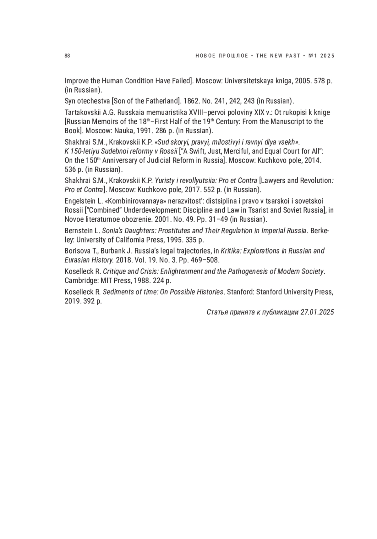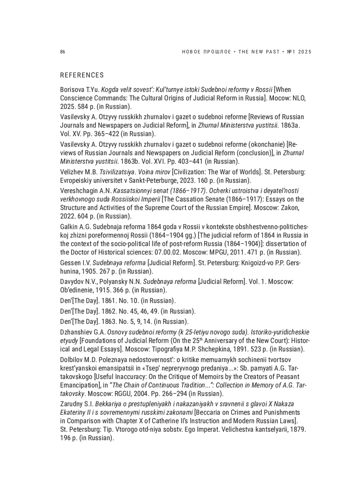 БОРИСОВА Т. Ю. НАКАНУНЕ СУДЕБНОЙ РЕФОРМЫ 1864 Г.: ПРОБЛЕМАТИЗАЦИЯ РЕЖИМОВ ТЕМПОРАЛЬНОСТИ В РАЗВИТИИ РОССИЙСКОГО ПРАВОСУДИЯ В 1860-1870-Е ГГ // НОВОЕ ПРОШЛОЕ. 2025. № 1