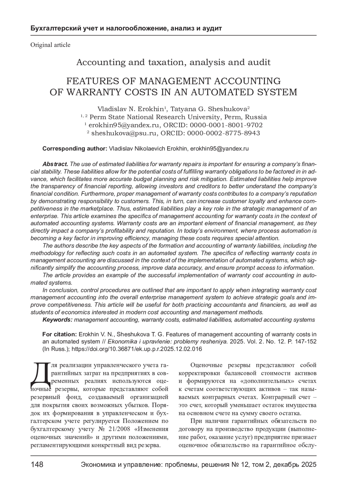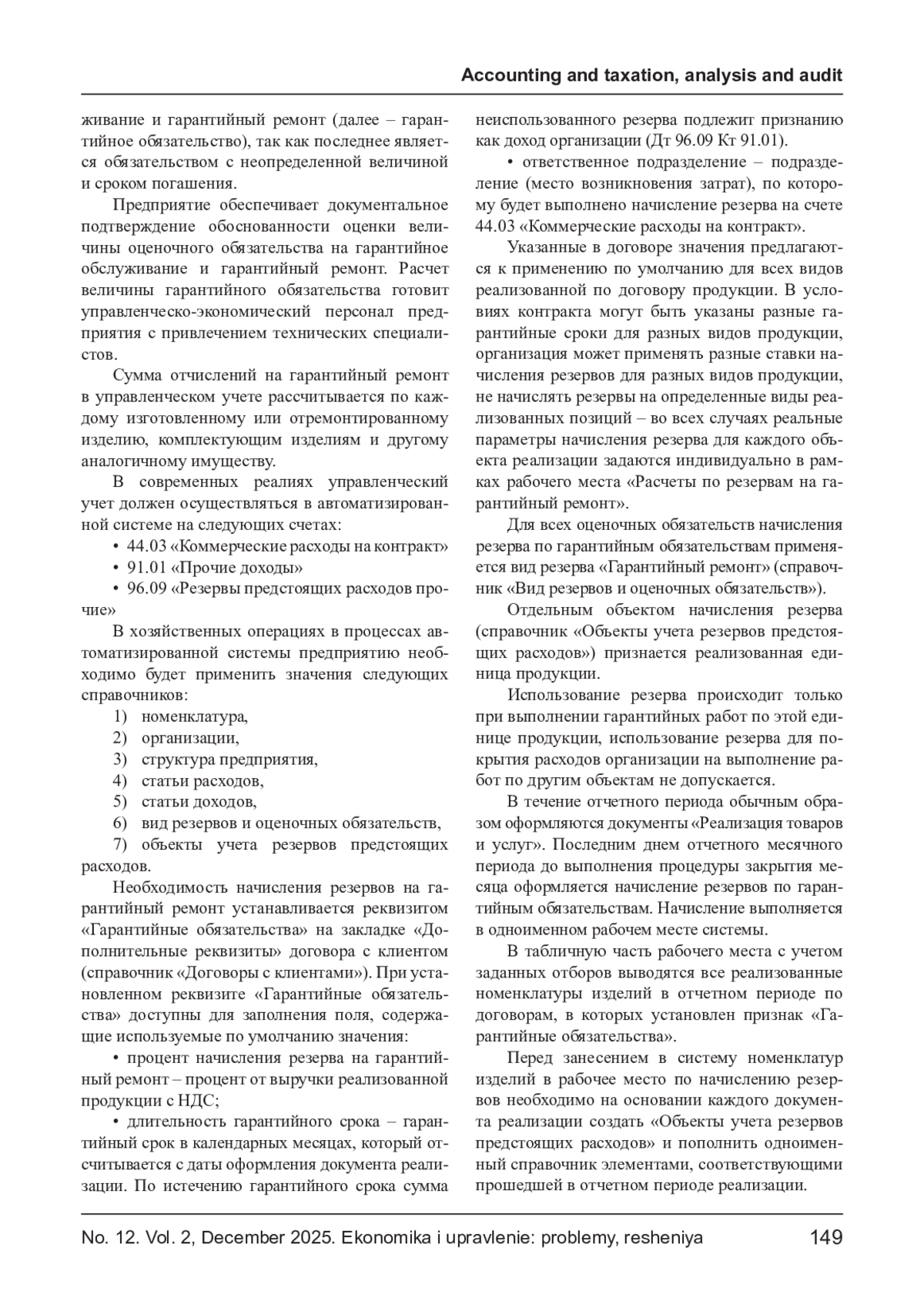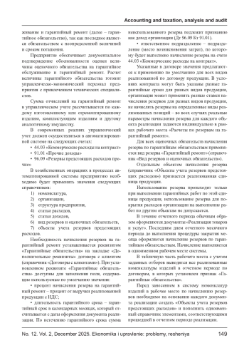 Применение оценочных обязательств по гарантийному ремонту важно для обеспечения финансовой стабильности компании. Эти обязательства позволяют заранее учитывать потенциальные затраты на выполнение гарантийных обязательств, что способствует более точному планированию бюджета и снижению рисков. Оценочные обязательства помогают улучшить прозрачность финансовой отчетности, позволяя инвесторам и кредиторам лучше понимать финансовое состояние компании. Кроме того, правильное управление гарантийными затратами способствует укреплению репутации компании, так как демонстрирует ответственность перед клиентами. Это, в свою очередь, может повысить лояльность клиентов и увеличить конкурентоспособность на рынке. Таким образом, оценочные обязательства играют ключевую роль в стратегическом управлении предприятием. В статье рассматриваются особенности управленческого учета гарантийных затрат в контексте автоматизированных систем учета. Гарантийные затраты представляют собой важный элемент финансового управления, так как они напрямую влияют на прибыльность и репутацию компании. В современных условиях, когда автоматизация процессов становится ключевым фактором для повышения эффективности, управление этими затратами требует особого внимания. Авторы отображают основные аспекты формирования и учета гарантийных обязательств, включая методику отражения таких затрат в автоматизированной системе. Особенности отражения в управленческом учете гарантийных затрат рассматривается в аспекте внедрения автоматизированных систем, которые позволяют значительно упростить процесс учета, повысить точность данных и обеспечить оперативный доступ к информации. В статье приводится пример успешной реализации учета гарантийных затрат на практике в автоматизированных системах. В заключение обозначаются контрольные процедуры, которые важно применять при интеграции управленческого учета гарантийных затрат в общую систему управления предприятием для достижения стратегических целей и повышения конкурентоспособности. Статья будет полезна как практикующим бухгалтерам и финансистам, так и студентам экономических специальностей, интересующимся современными методами учета и управления затратами.