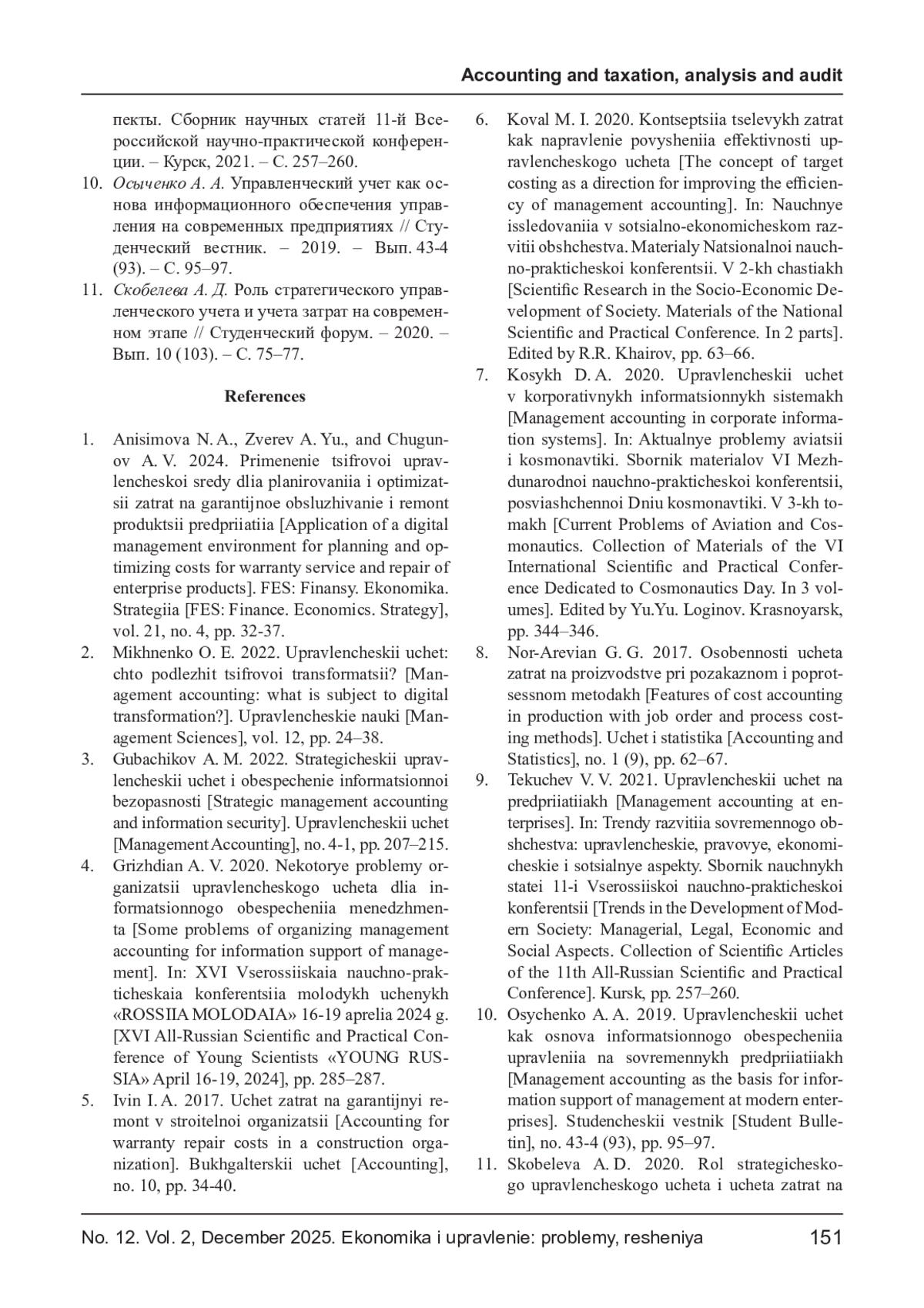2. Михненко О. Е. Управленческий учет: что подлежит цифровой трансформации? // Управленческие науки. - 2022. - Т. 12. - С. 24-38.