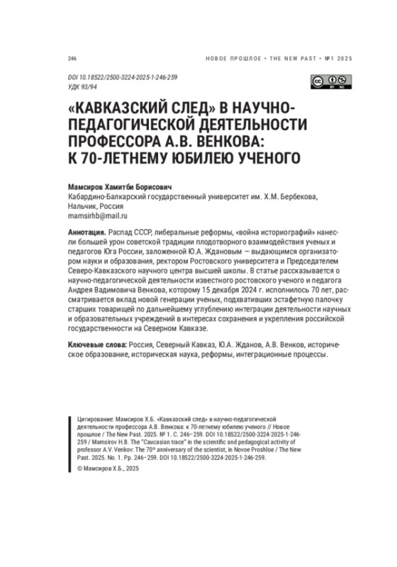 Распад СССР, либеральные реформы, «война историографий» нанесли большей урон советской традиции плодотворного взаимодействия ученых и педагогов Юга России, заложенной Ю. А. Ждановым — выдающимся организатором науки и образования, ректором Ростовского университета и Председателем Северо-Кавказского научного центра высшей школы. В статье рассказывается о научно-педагогической деятельности известного ростовского ученого и педагога Андрея Вадимовича Венкова, которому 15 декабря 2024 г. исполнилось 70 лет, рассматривается вклад новой генерации ученых, подхвативших эстафетную палочку старших товарищей по дальнейшему углублению интеграции деятельности научных и образовательных учреждений в интересах сохранения и укрепления российской государственности на Северном Кавказе.