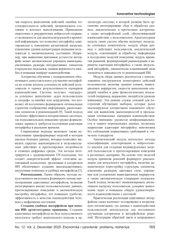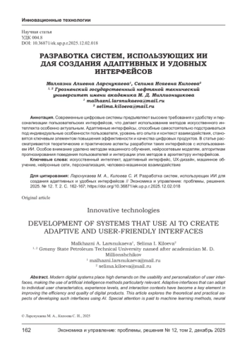 Современные цифровые системы предъявляют высокие требования к удобству и персонализации пользовательских интерфейсов, что делает использование методов искусственного интеллекта особенно актуальным. Адаптивные интерфейсы, способные самостоятельно подстраиваться под индивидуальные особенности пользователя, уровень его опыта и контекст взаимодействия, становятся ключевым элементом повышения эффективности и качества цифровых продуктов. В статье рассматриваются теоретические и практические аспекты разработки таких интерфейсов с использованием ИИ. Особое внимание уделено методам машинного обучения, нейросетевым моделям, алгоритмам прогнозирования поведения пользователей и интеграции этих методов в архитектуру интерфейсов.