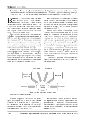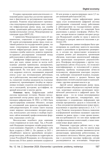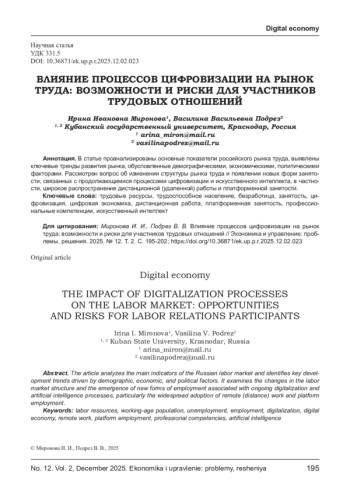 Анализ воздействия цифровизации на рынок труда и сферу трудовых отношений представляет собой относительно новую область исследования, вместе с тем в последние десятилетия в этой сфере происходят значительные изменения, связанные, в первую очередь, с изменением характера взаимодействия субъектов на рынке труда.