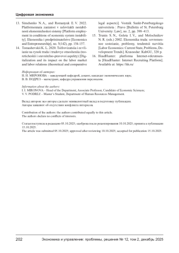 13. Симченко Н. А. Платформенная занятость в условиях нестабильности экономической системы / Н. А. Симченко Е. В. Романюк // Экономика и предпринимательство. - 2022. - № 5(142). - С. 154-157.