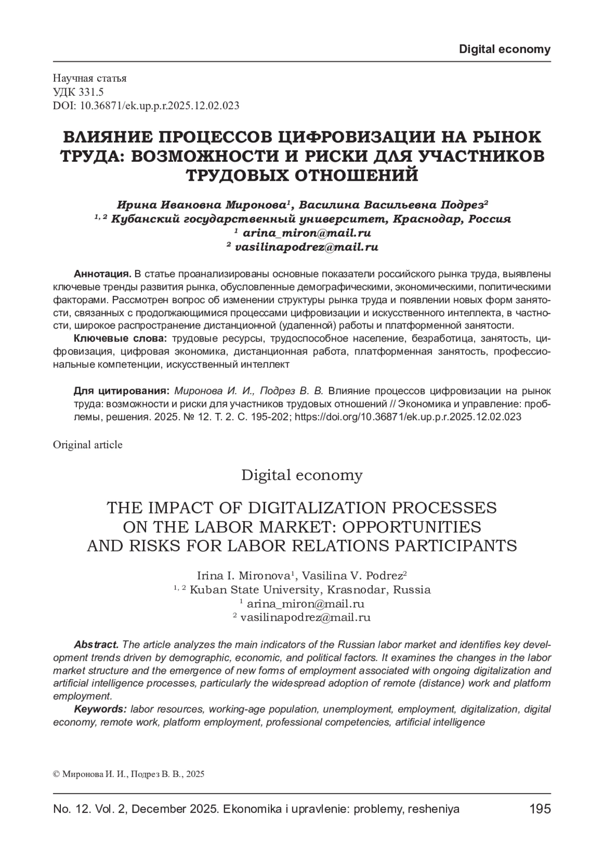 11. Миронова И. И. Танасейчук Н. В. Влияние трансформации занятости на показатели производительности труда: теоретико-методологический анализ // Экономический вестник. - 2025. - Т. 4, № 3. - С. 52-59.