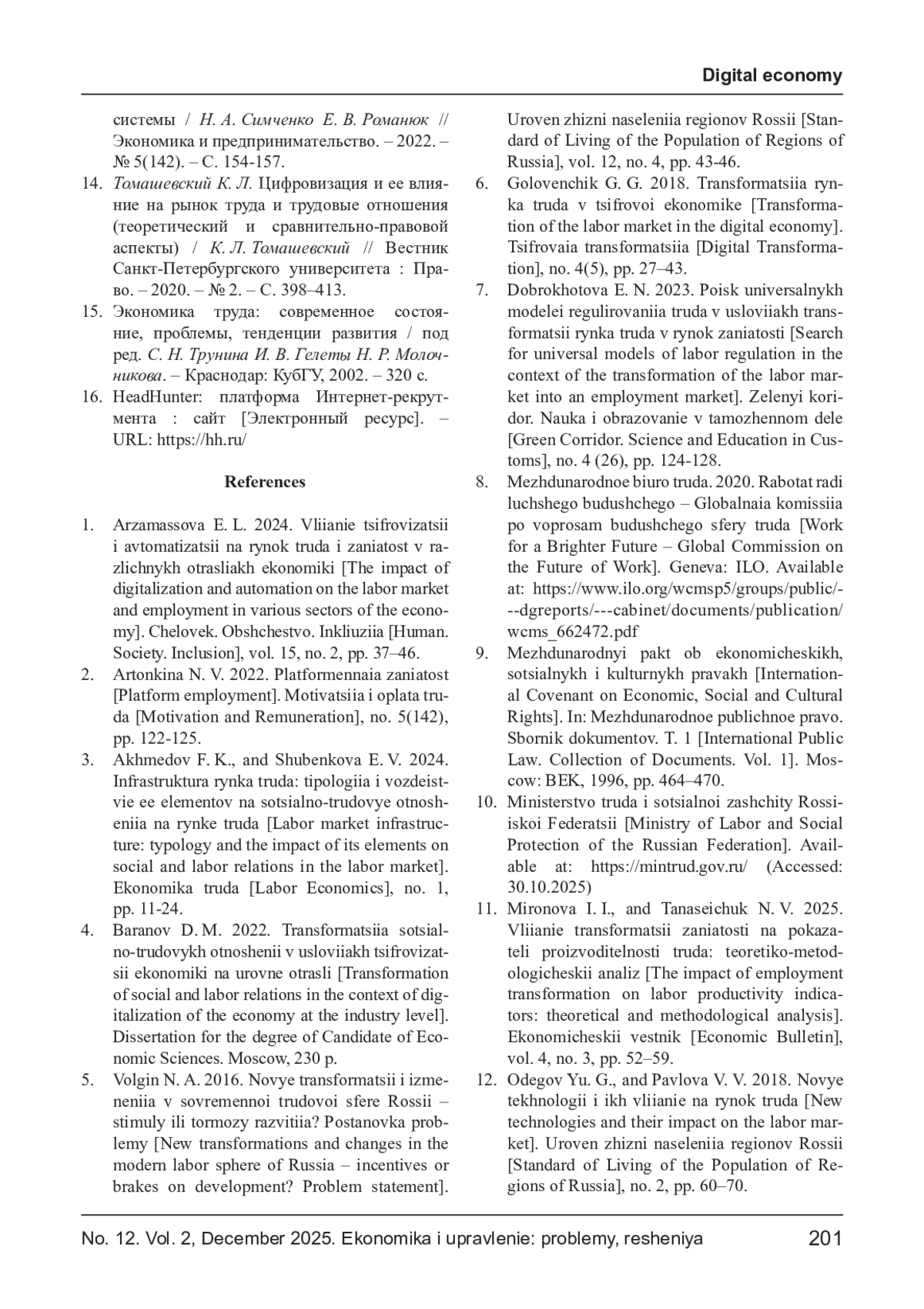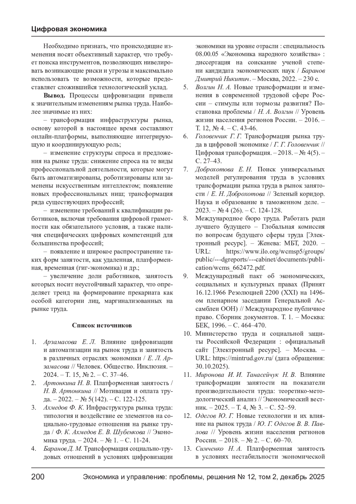 6. Головенчик Г. Г. Трансформация рынка труда в цифровой экономике / Г. Г. Головенчик // Цифровая трансформация. - 2018. - № 4(5). - С. 27-43.
