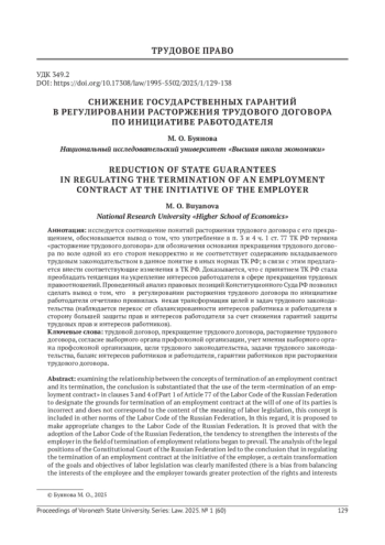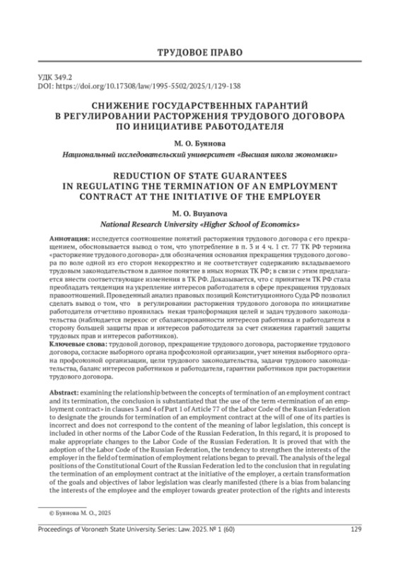БУЯНОВА М.О. СНИЖЕНИЕ ГОСУДАРСТВЕННЫХ ГАРАНТИЙ В РЕГУЛИРОВАНИИ РАСТОРЖЕНИЯ ТРУДОВОГО ДОГОВОРА ПО ИНИЦИАТИВЕ РАБОТОДАТЕЛЯ // ВЕСТНИК ВОРОНЕЖСКОГО ГОСУДАРСТВЕННОГО УНИВЕРСИТЕТА. СЕРИЯ: ПРАВО. 2025. № 1 (60)