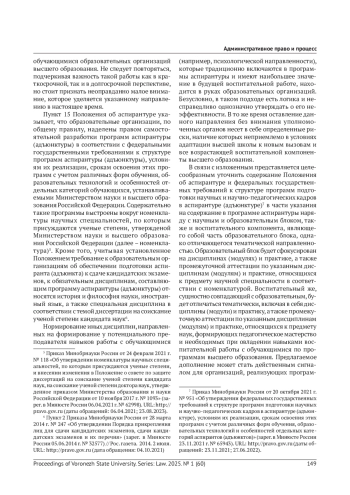 Пункт 15 Положения об аспирантуре указывает, что образовательные организации, по общему правилу, наделены правом самостоятельной разработки программ аспирантуры (адъюнктуры) в соответствии с федеральными государственными требованиями к структуре программ аспирантуры (адъюнктуры), условиям их реализации, срокам освоения этих программ с учетом различных форм обучения, образовательных технологий и особенностей отдельных категорий обучающихся, устанавливаемыми Министерством науки и высшего образования Российской Федерации. Содержательно такие программы выстроены вокруг номенклатуры научных специальностей, по которым присуждаются ученые степени, утвержденой Министерством науки и высшего образования Российской Федерации (далее – номенклатура).