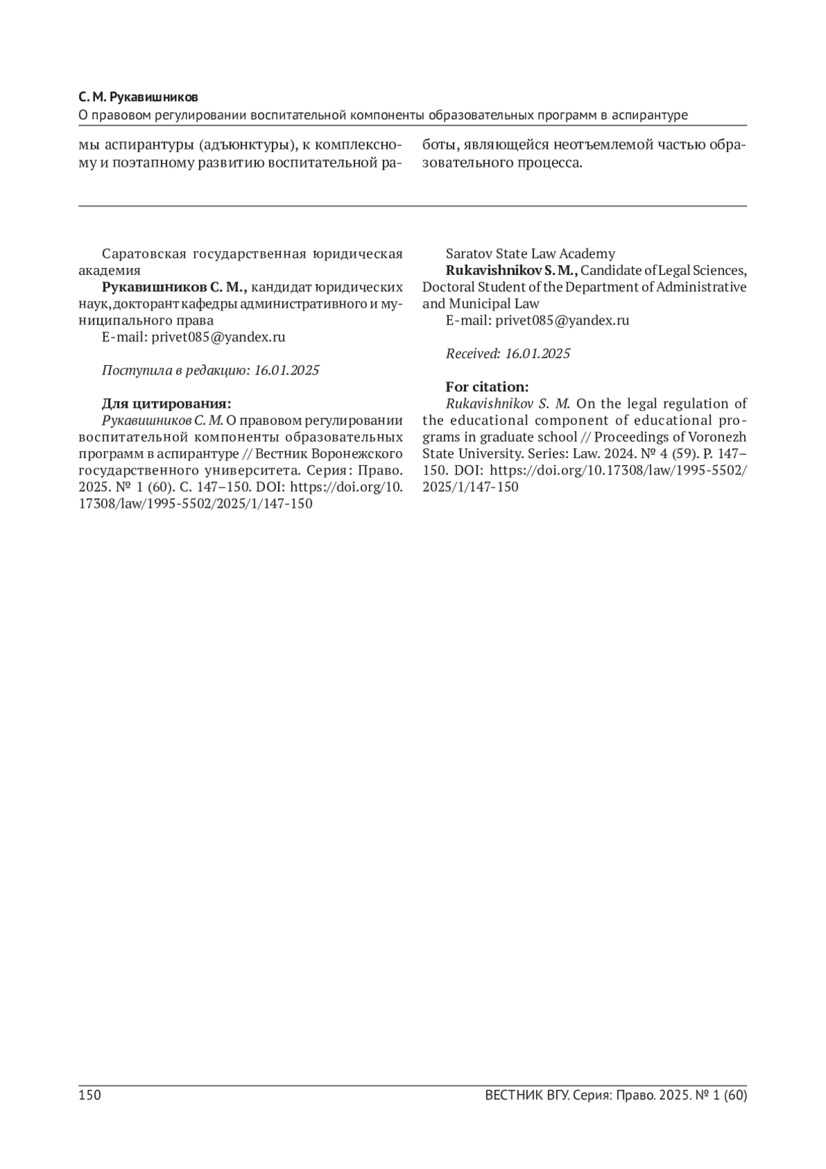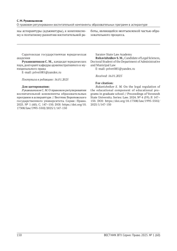 Аспирантура, как ключевой институт подготовки научных и научно-педагогических кадров, нуждается в постоянном совершенствовании с точки зрения правового регулирования с целью соответствия вызовам, которые существуют сегодня в сфере реализации научно-образовательной политики. Контроль качества образования, получаемого аспирантами, имеет, фактически, двойную актуальность, касаясь как квалификации самих обучающихся по программам аспирантуры, так и квалификации тех обучающихся, с которыми будут работать выпускники аспирантуры - будущие преподаватели. Автором выявлены несовершенства в существующем правовом регулировании данной сферы и предложены возможные пути решения.