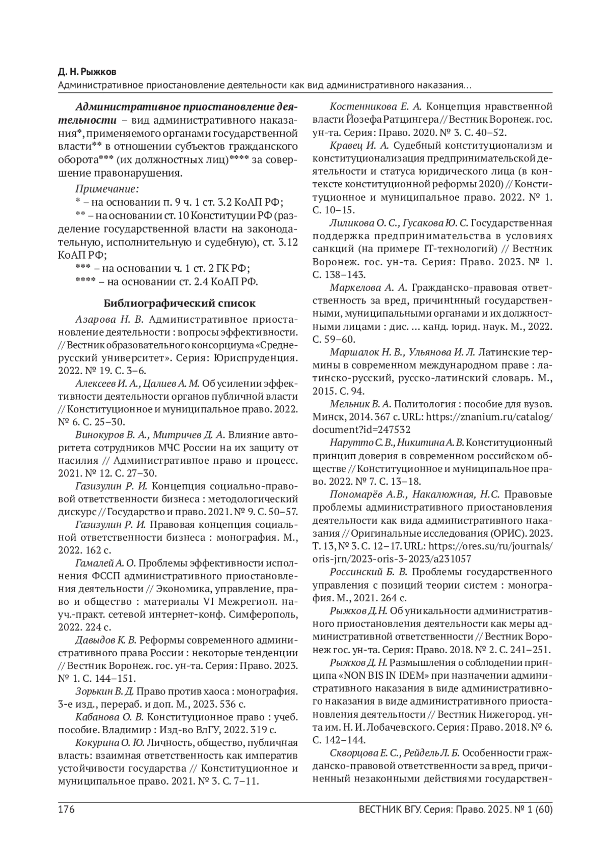 20. Рыжков Д.Н. Об уникальности административного приостановления деятельности как меры административной ответственности // Вестник Воронеж гос. ун-та. Серия: Право. 2018. № 2. С. 241-251. EDN: XVFKEX