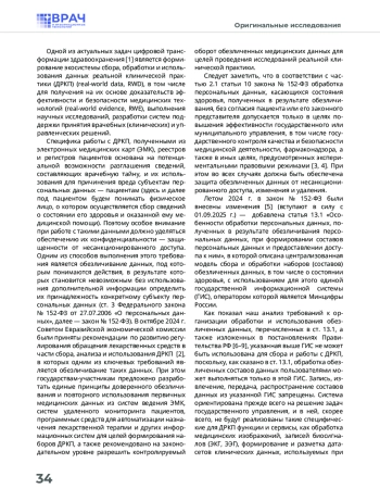 Ключевые фразы: данные реальной клинической практики, защита персональных данных, обезличивание персо- нальных данных, информационные технологии