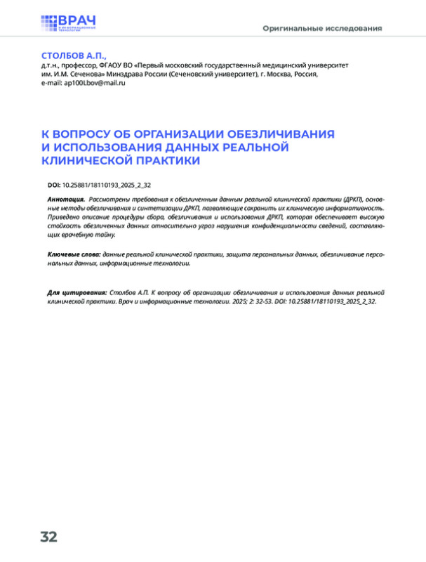 СТОЛБОВ А.П. К ВОПРОСУ ОБ ОРГАНИЗАЦИИ ОБЕЗЛИЧИВАНИЯ И ИСПОЛЬЗОВАНИЯ ДАННЫХ РЕАЛЬНОЙ КЛИНИЧЕСКОЙ ПРАКТИКИ // ВРАЧ И ИНФОРМАЦИОННЫЕ ТЕХНОЛОГИИ. 2025. № 2
