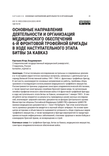 Статья: ОСНОВНЫЕ НАПРАВЛЕНИЯ ДЕЯТЕЛЬНОСТИ И ОРГАНИЗАЦИЯ МЕДИЦИНСКОГО ОБЕСПЕЧЕНИЯ 6-Й ФРОНТОВОЙ ТРОФЕЙНОЙ БРИГАДЫ В ХОДЕ НАСТУПАТЕЛЬНОГО ЭТАПА БИТВЫ ЗА КАВКАЗ (2025)
