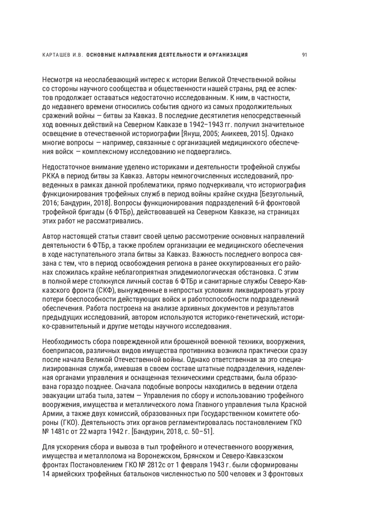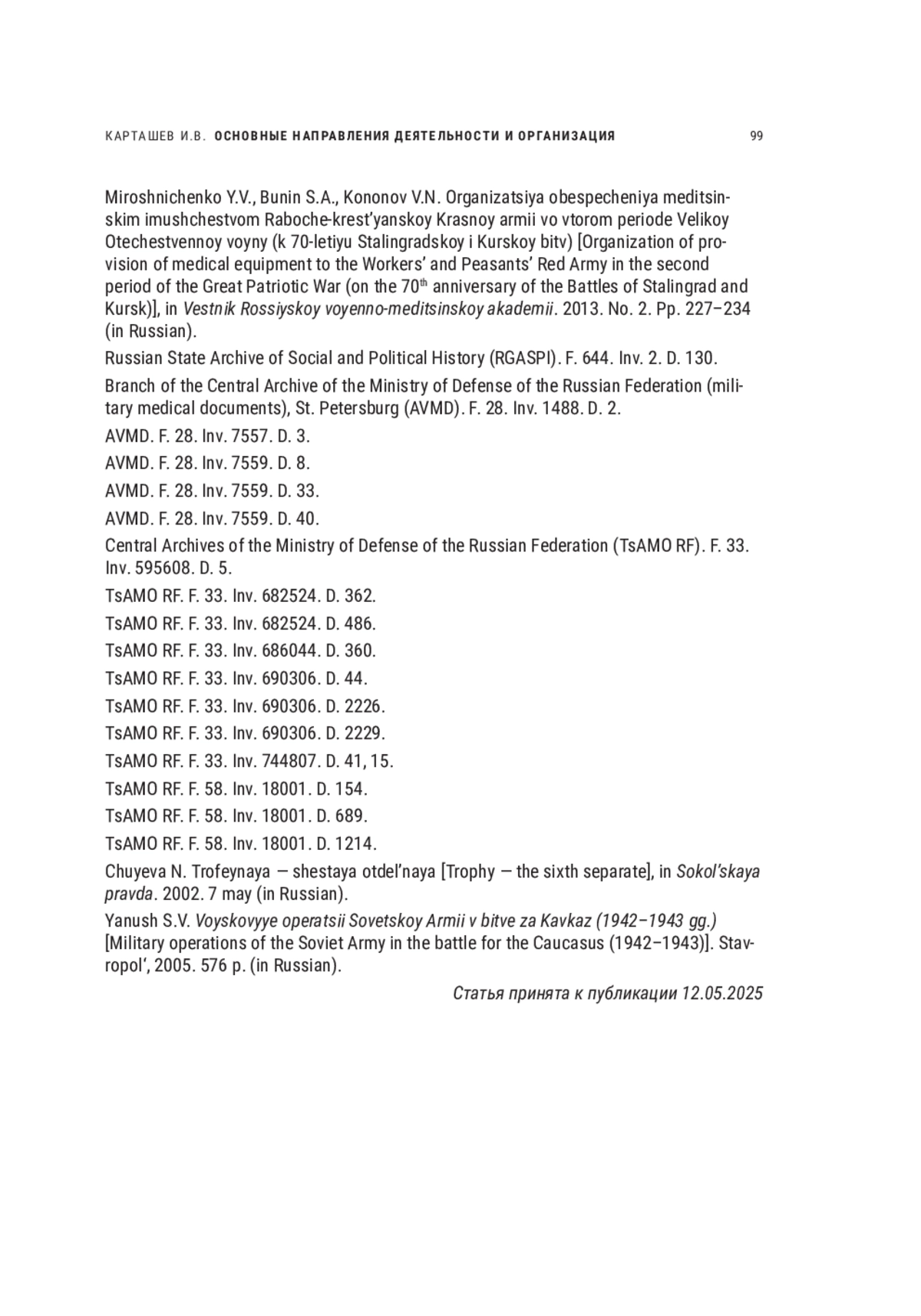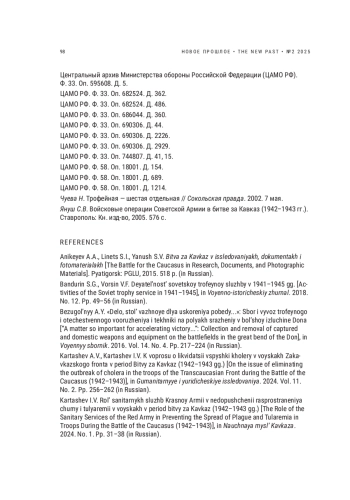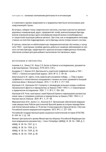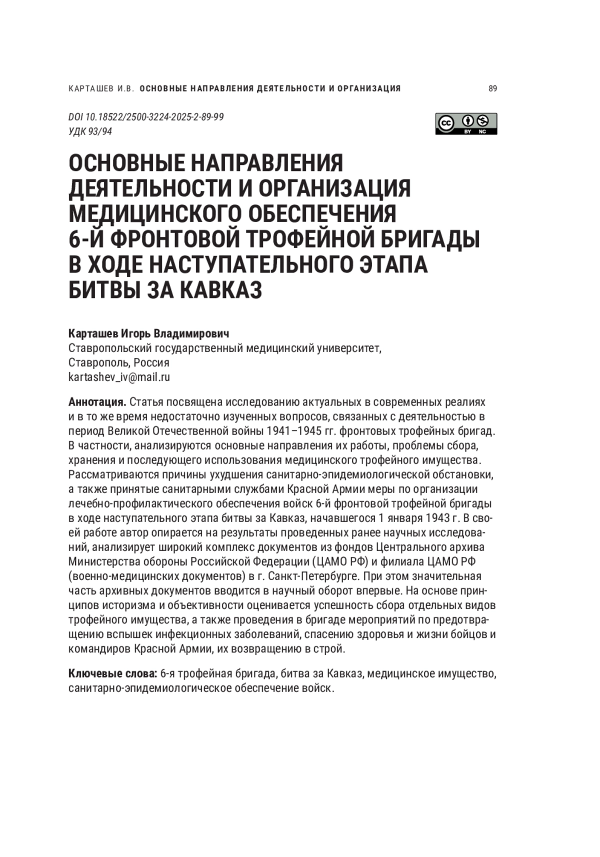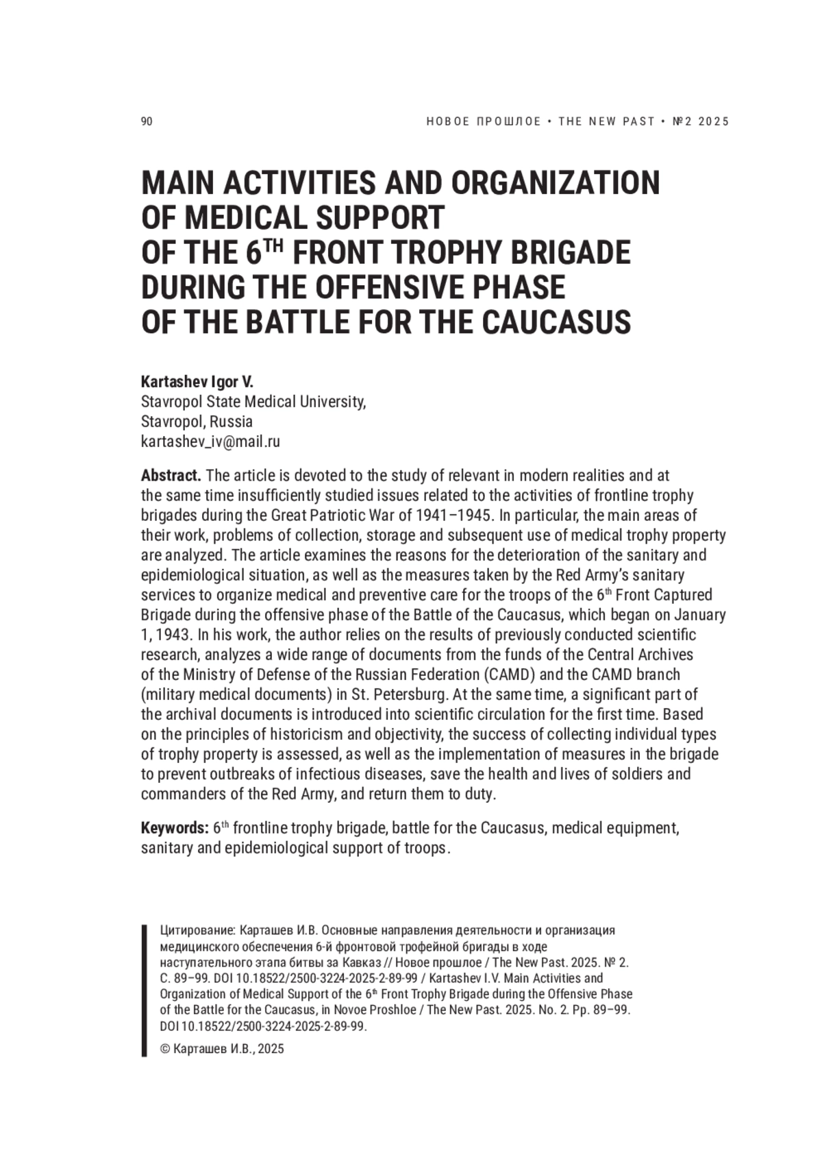 КАРТАШЕВ И. В. ОСНОВНЫЕ НАПРАВЛЕНИЯ ДЕЯТЕЛЬНОСТИ И ОРГАНИЗАЦИЯ МЕДИЦИНСКОГО ОБЕСПЕЧЕНИЯ 6-Й ФРОНТОВОЙ ТРОФЕЙНОЙ БРИГАДЫ В ХОДЕ НАСТУПАТЕЛЬНОГО ЭТАПА БИТВЫ ЗА КАВКАЗ // НОВОЕ ПРОШЛОЕ. 2025. № 2