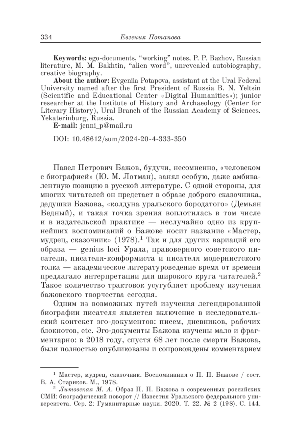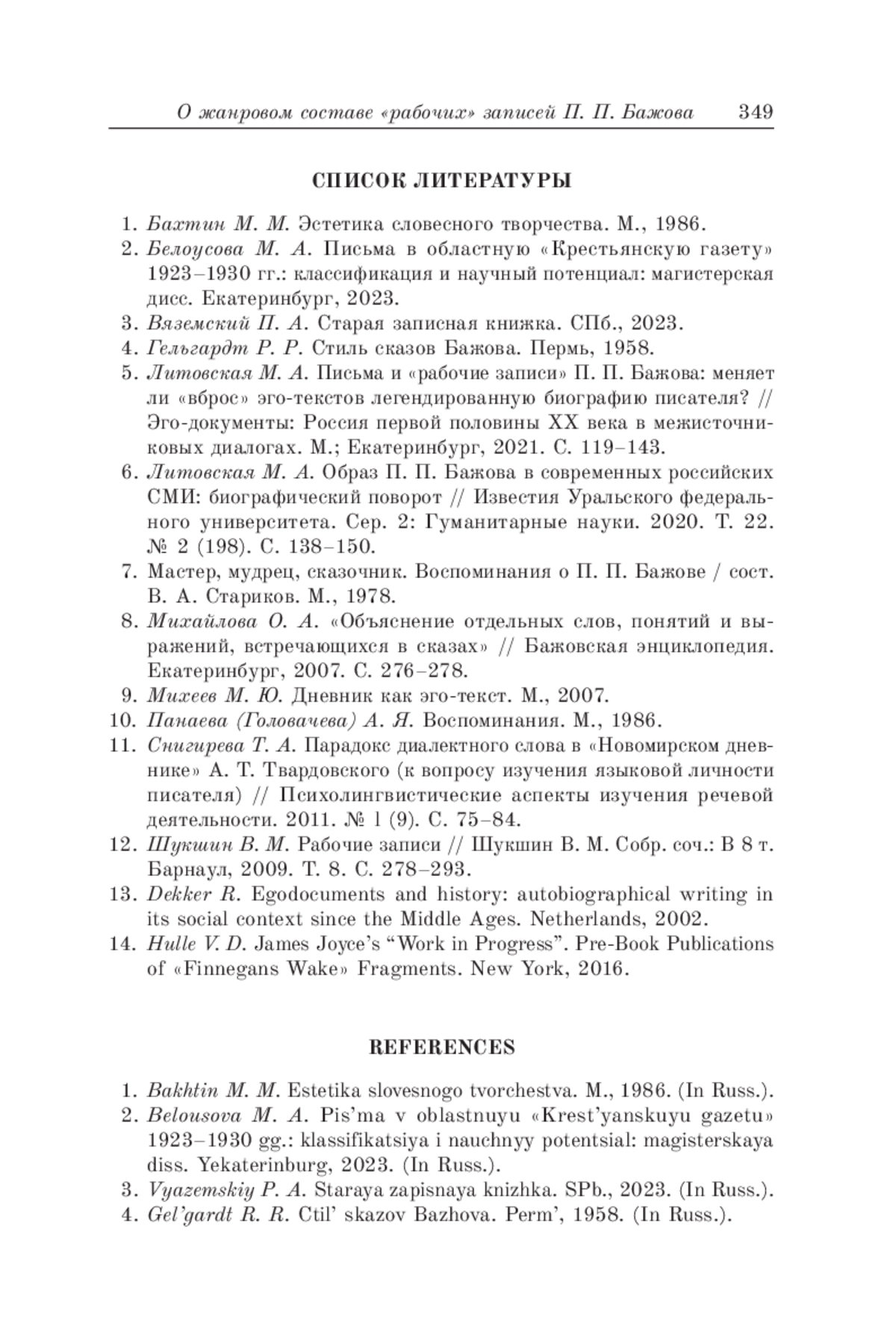 5. Литовская М. А. Письма и “рабочие записи” П. П. Бажова: меняет ли “вброс” эго-текстов легендированную биографию писателя? // Эго-документы: Россия первой половины ХХ века в межисточниковых диалогах. М.; Екатеринбург, 2021. С. 119-143.