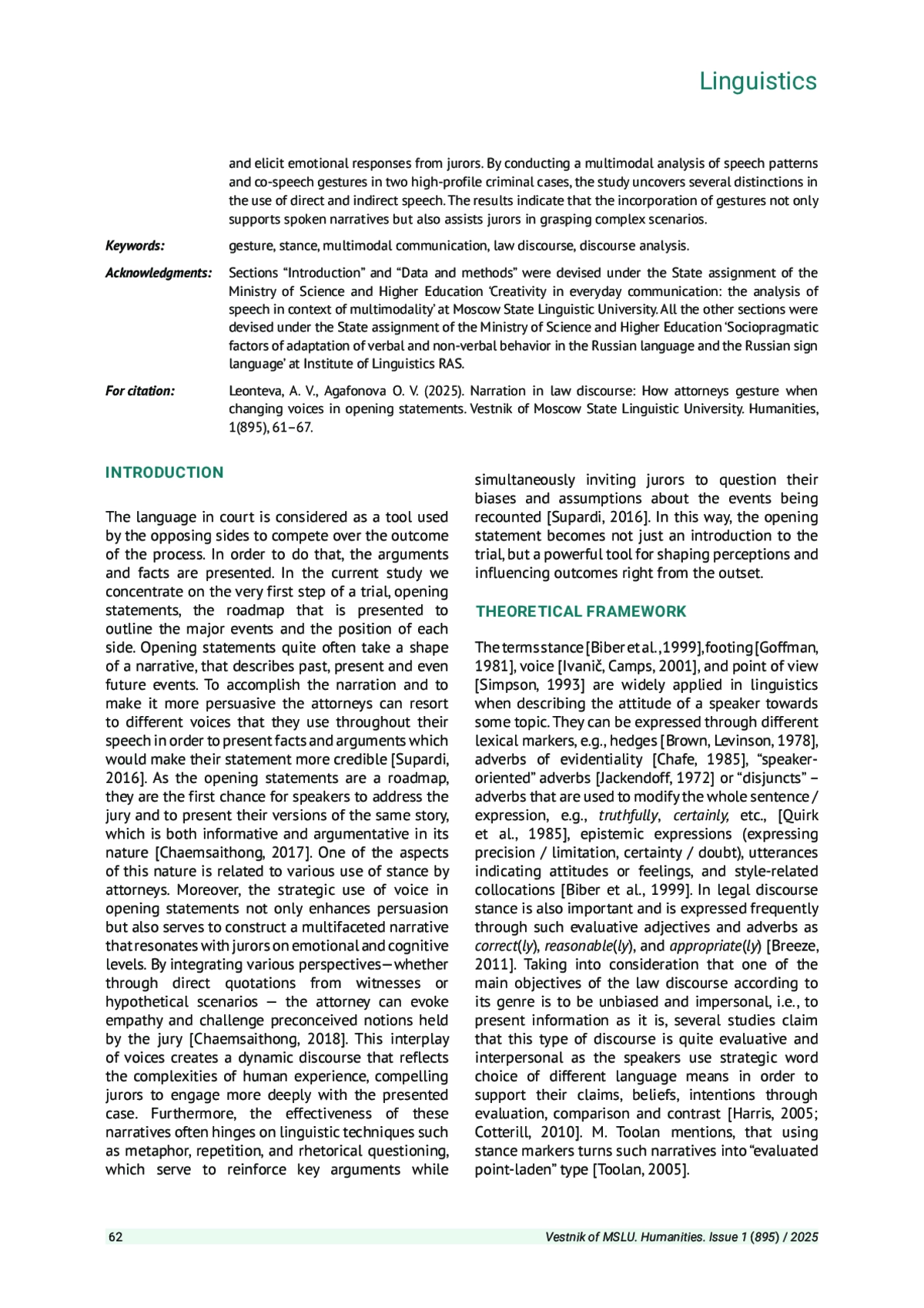 3. Chaemsaithong K. Use of voices in legal opening statements // Social Semiotics. 2018. Vol. 28, № 1. P. 90-107.